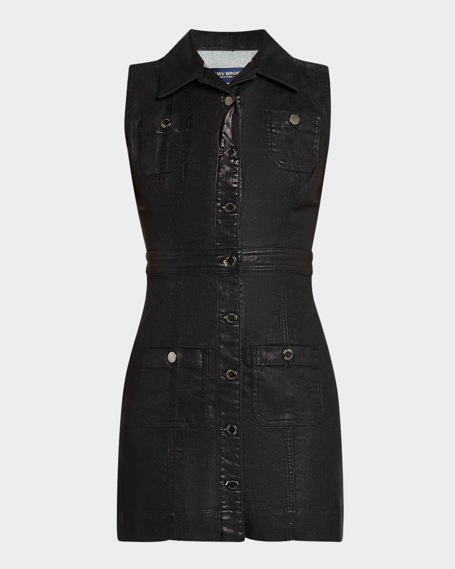 Ramy Brook "Katalina" metallic coated denim dress Approx. 33"L from shoulder to hem Spread collar; button front Sleeveless Front patch pockets Hem falls above the knee Body-skimming fit Cotton/polyester/polyurethane Dry clean Made in USA Model is 5'10"/177cm.