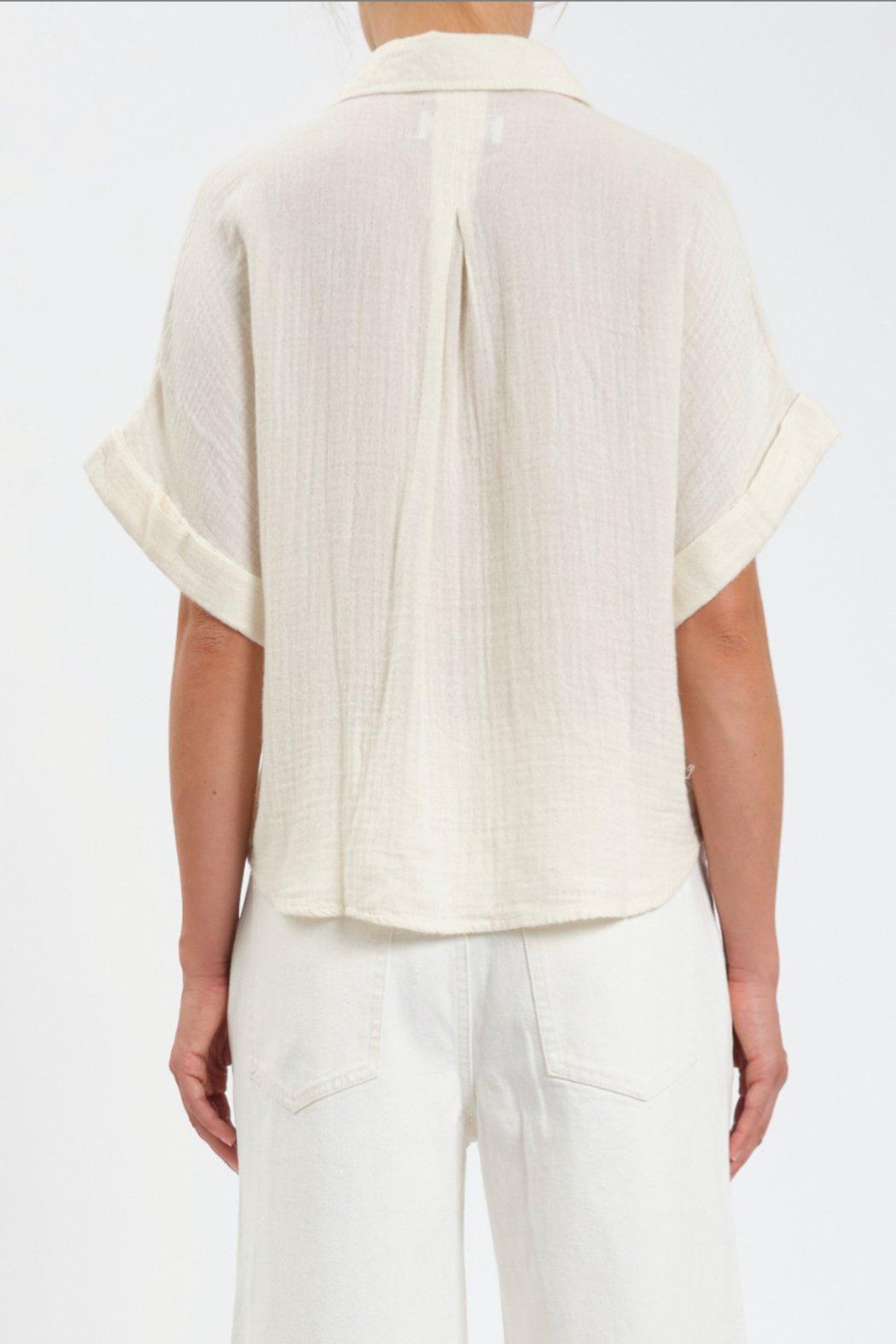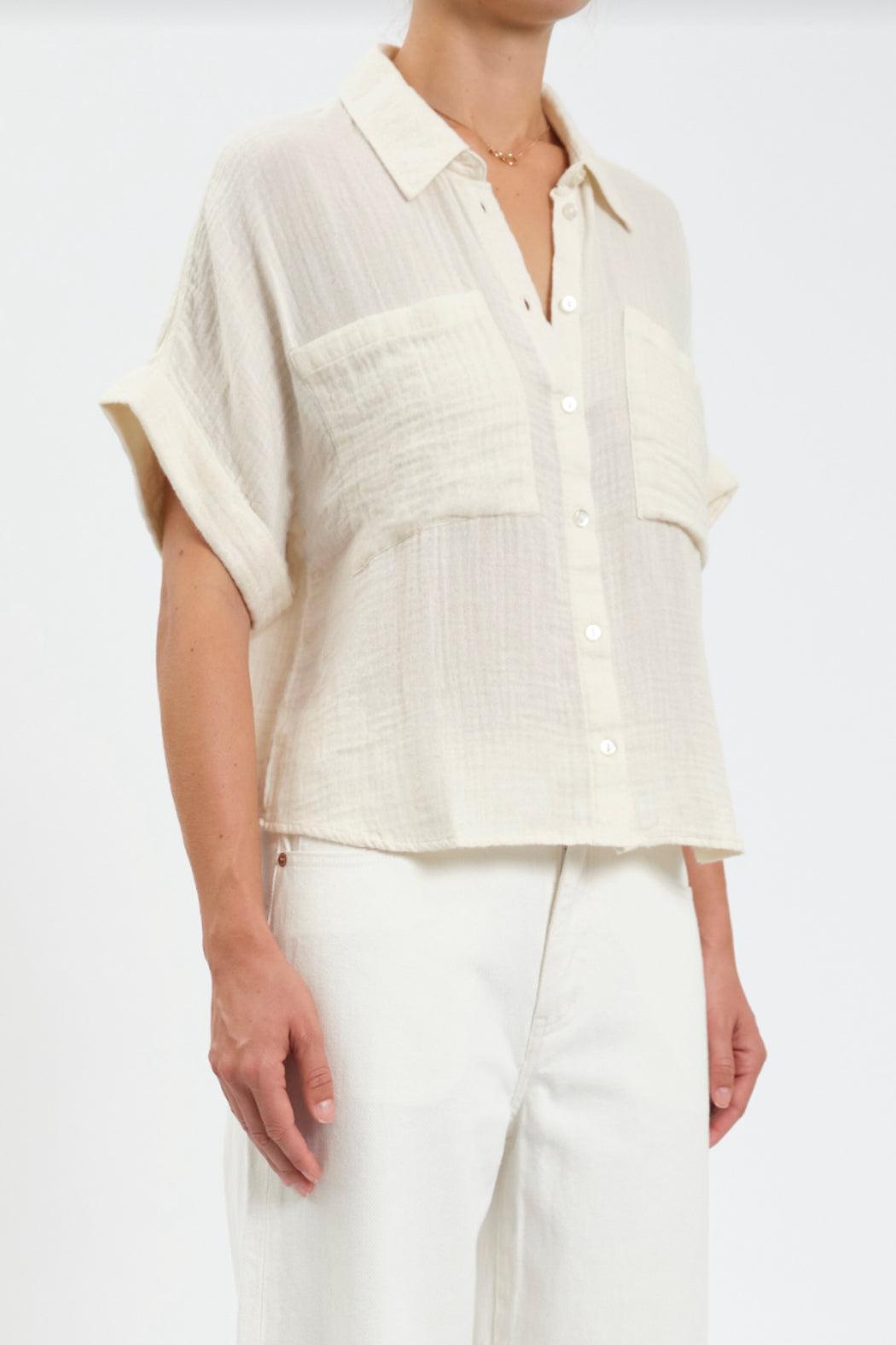 Kate is light and breezy button-up, in a bright coral shade. The perfect layering top, wear it over a tank or as a cover up.