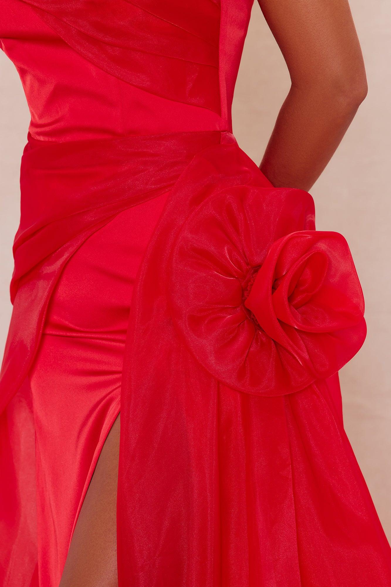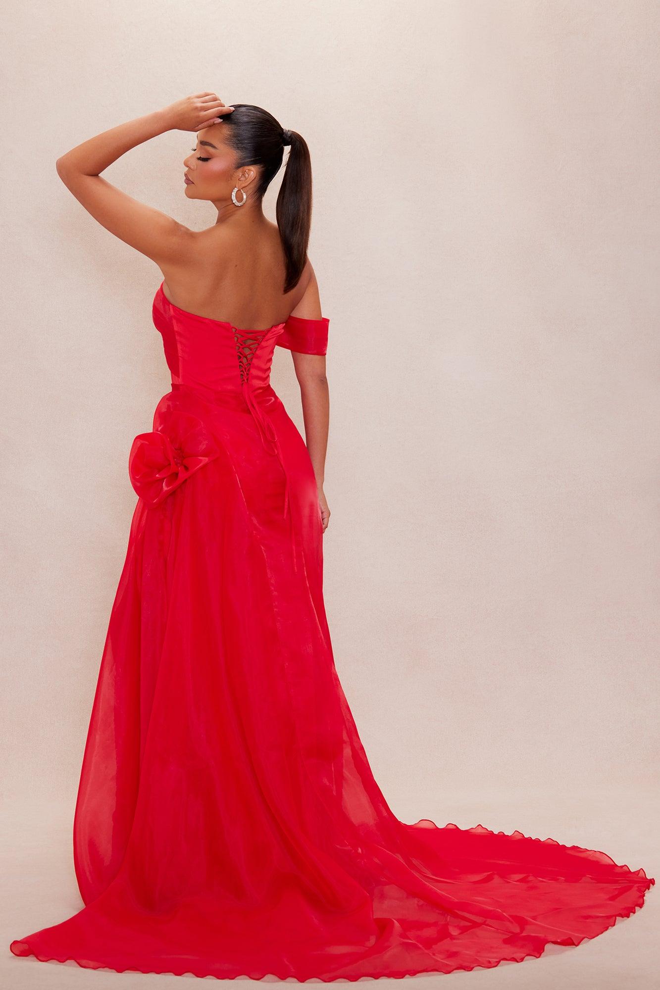 Available In Red. Gown Off Shoulder Grip Tape Padded Bra Cups Boning , Floral Applique Ruched, Slit Lace Up back, Back Zipper Closure Lined No Stretch Length= 55'', Back Length= 58.25'' Shell1: 90% Polyester 10% Spandex Shell2: 100% Polyester Lining: 100% Polyester Imported