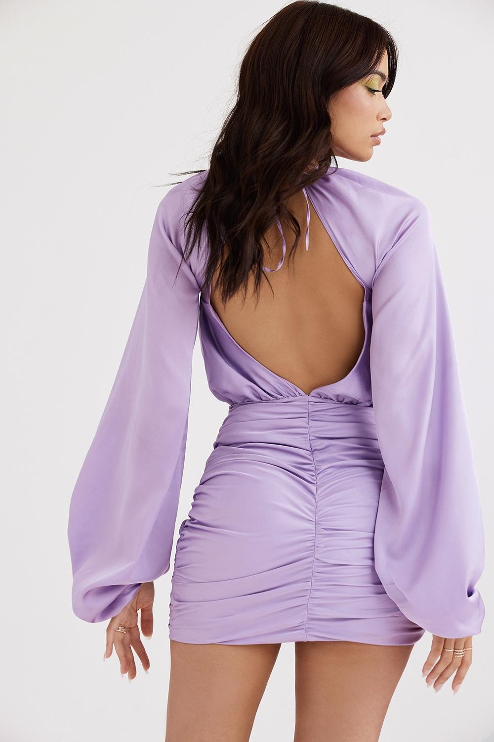 Pastel hues are your go-to this Spring and our 'Kate' mini dress is all about it. Cut from our lustrous fluid silk satin in a pretty orchid hue, Kate features a gently gathered bodice with cutouts at the shoulders and a flattering high neck, threaded with rouleau straps to tie as a halter neck and the open back is super sexy.