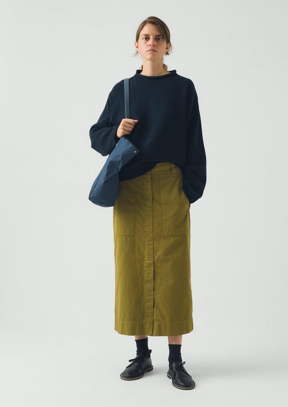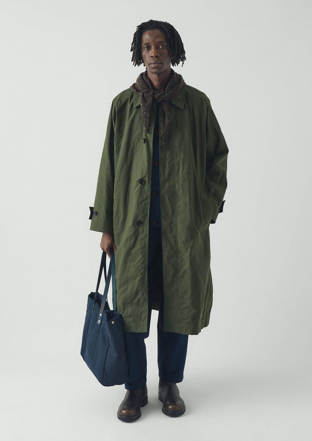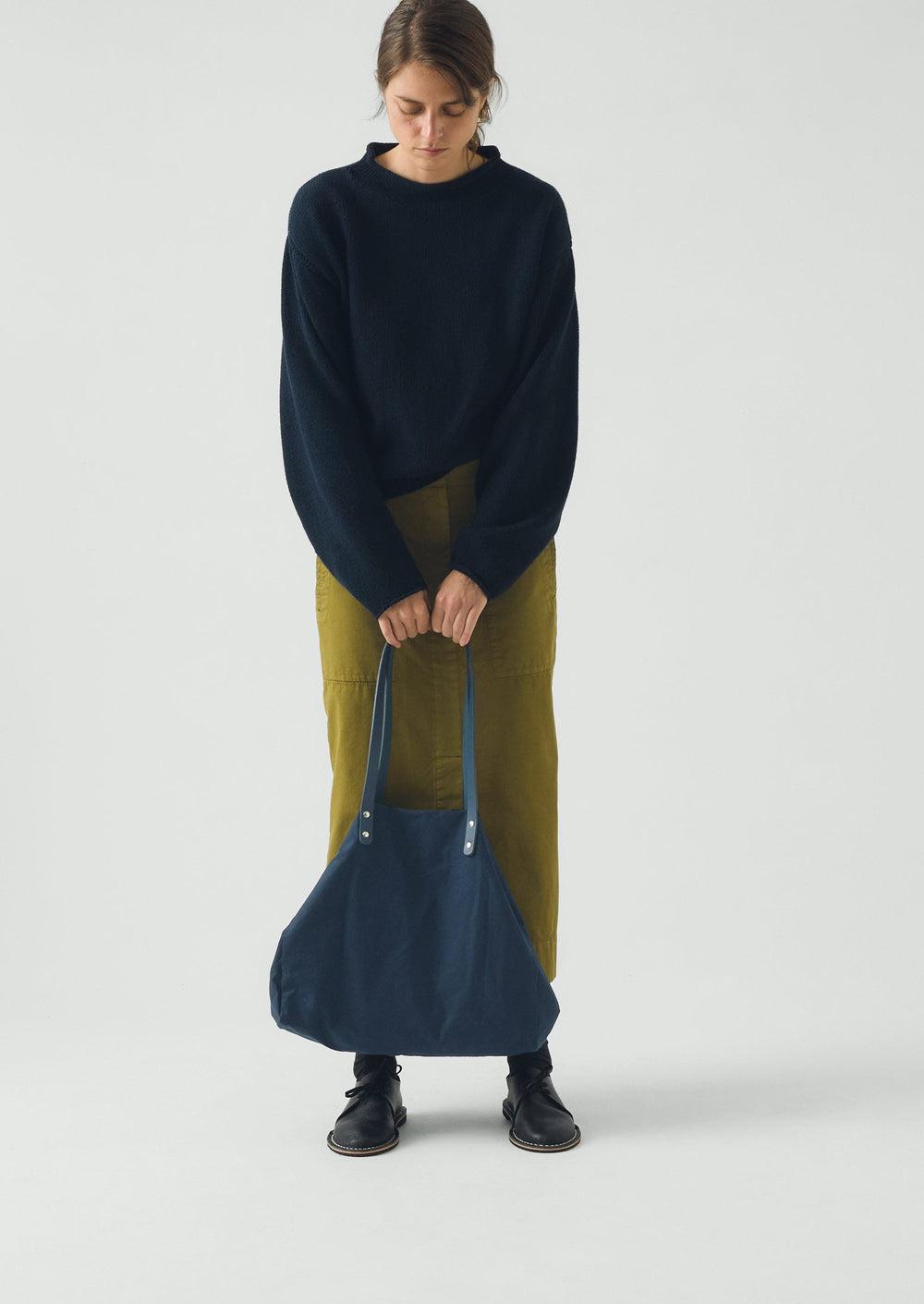Very roomy, generously sized tote in waxed British cotton. Exaggerated shape with sturdy leather handles. Unlined with an internal pocket and poppers to adjust the shape. Handmade in the UK by Kate Sheridan. The waxed surface creates a worn, textured look.