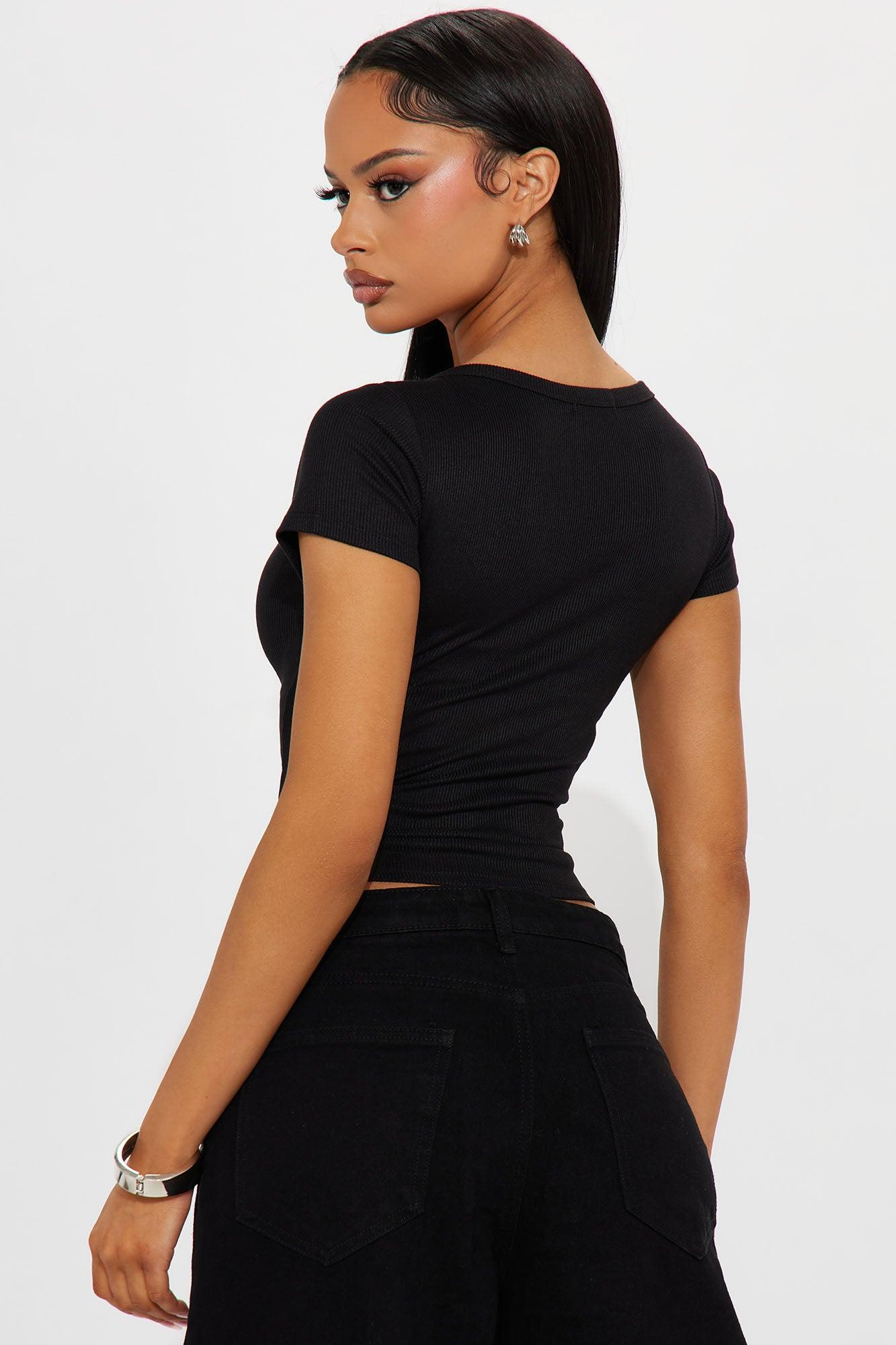 Katelyn Ribbed Short Sleeve Henley Top - Black