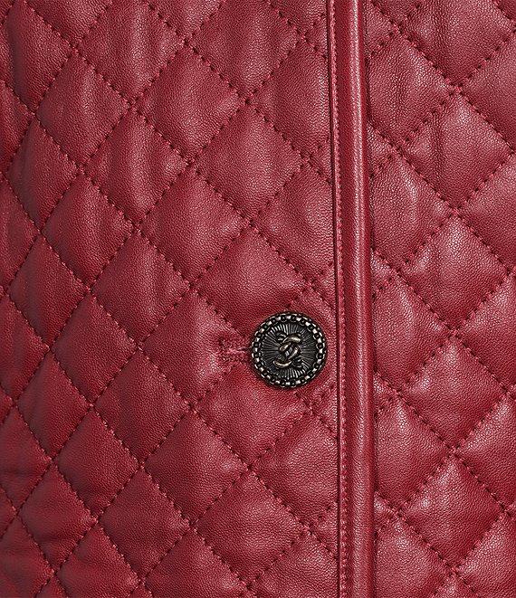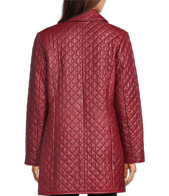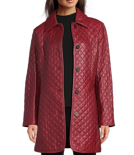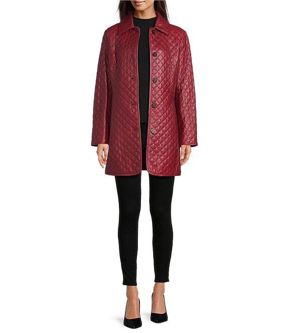 From Katherine Kelly, this jacket features: Quilted diamond stitch pattern Shirt collar neckline Long sleeves Lightweight filling Onseam hidden pockets Leather piped edge Novelty button front closure Approx. 39" center back length Genuine lamb leather Leather method dry cleaning Imported.