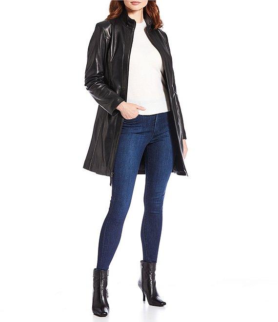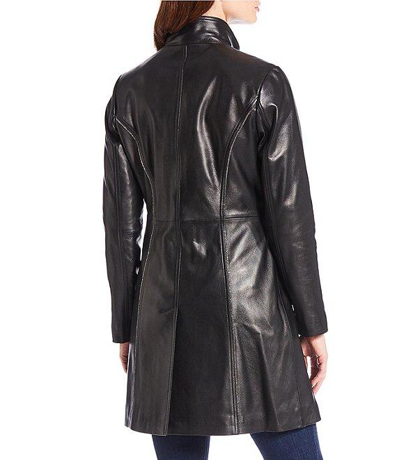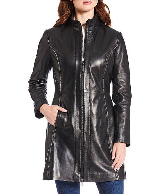 From Katherine Kelly, this jacket features: Stand collar neckline Long sleeves On-seam hidden pockets Back vent Double full-zip front closure Approx. 35" center back length Genuine lamb leather Detailed trim piping Leather method dry cleaning Imported.