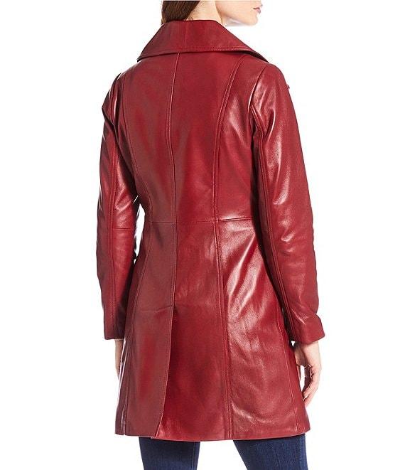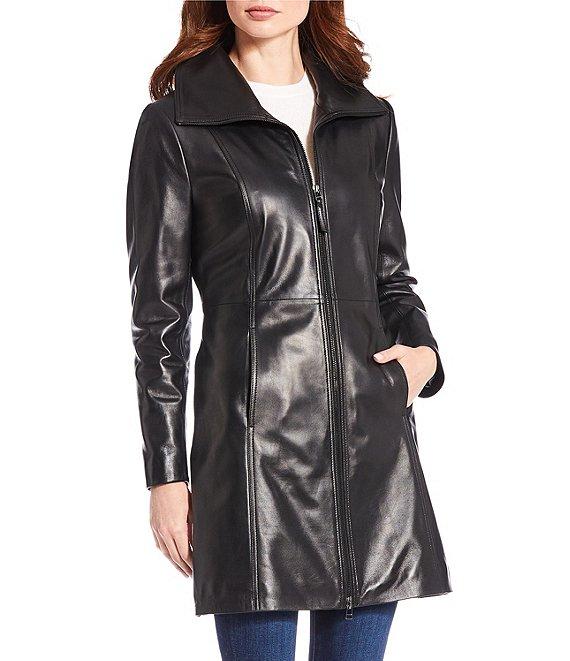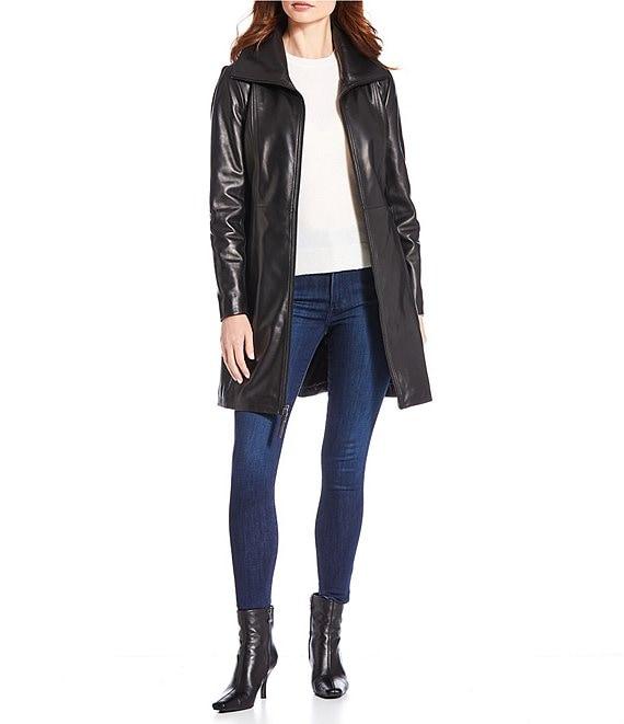 From Katherine Kelly, this jacket features: Wing collar neckline Long sleeves On-seam hidden pockets Back vent Double full-zip front closure Approx. 35.25" center back length Genuine lamb leather Leather method dry cleaning Imported.