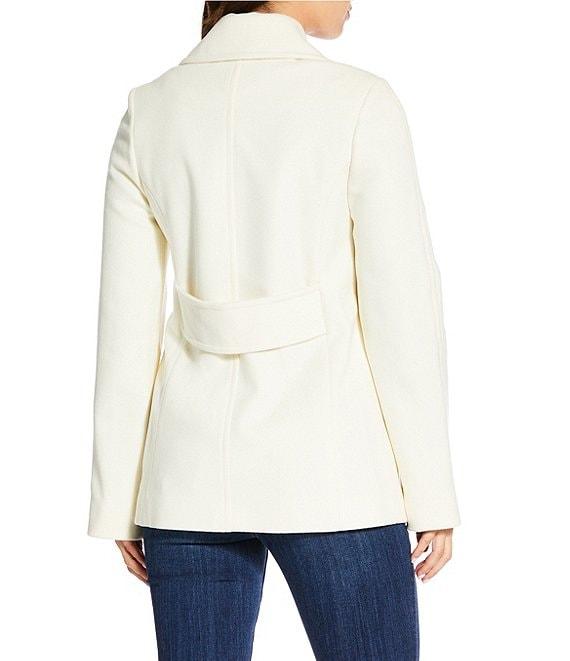 From Katherine Kelly, this coat features: Notch collar neckline Classic peacoat silhouette Full long sleeves Double breasted On-seam pockets with flap Faux back belt Approx. 28" center back length Wool Dry clean Imported.