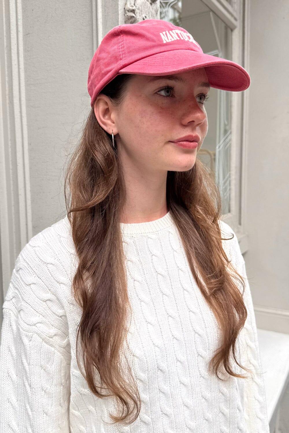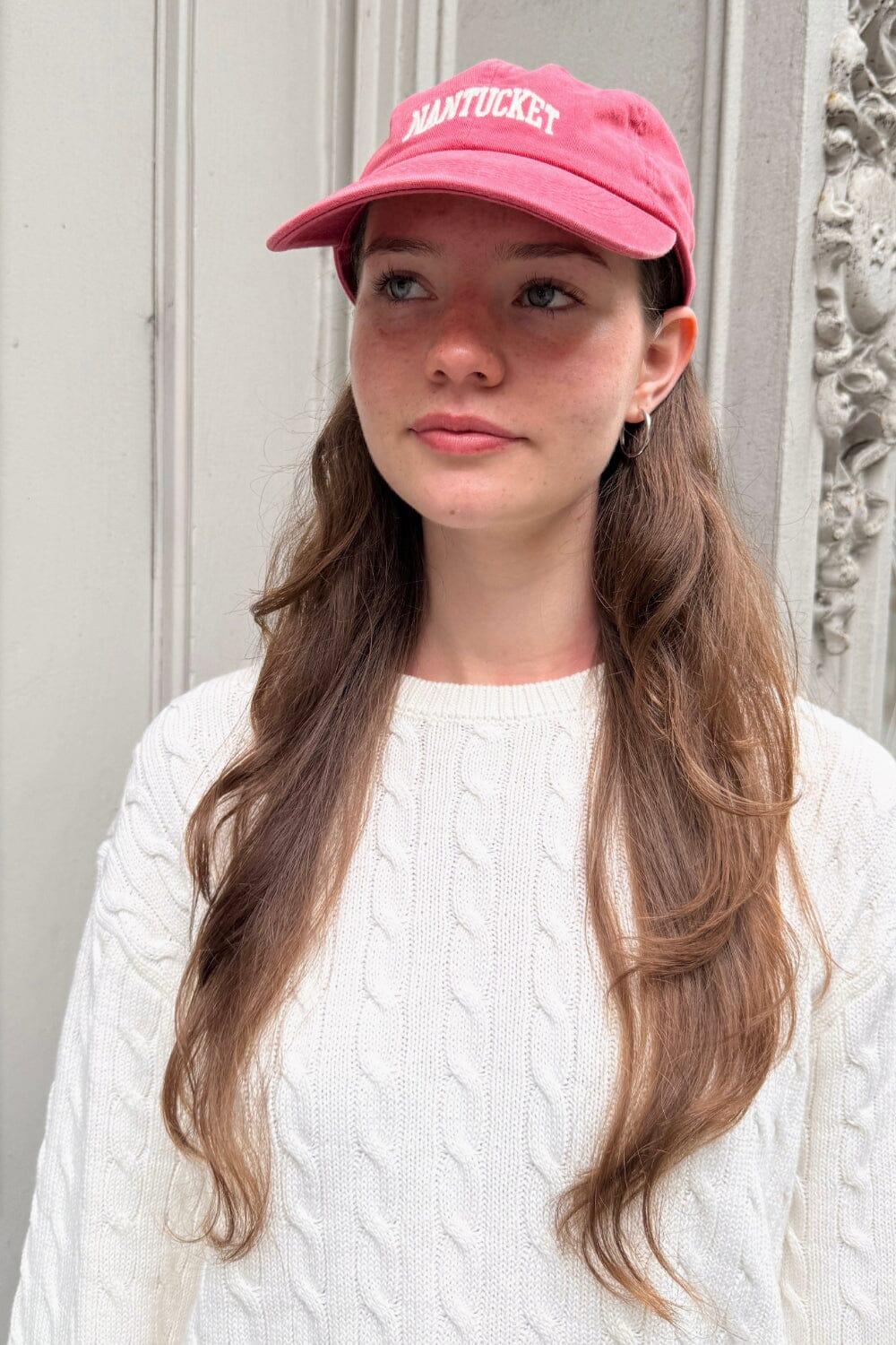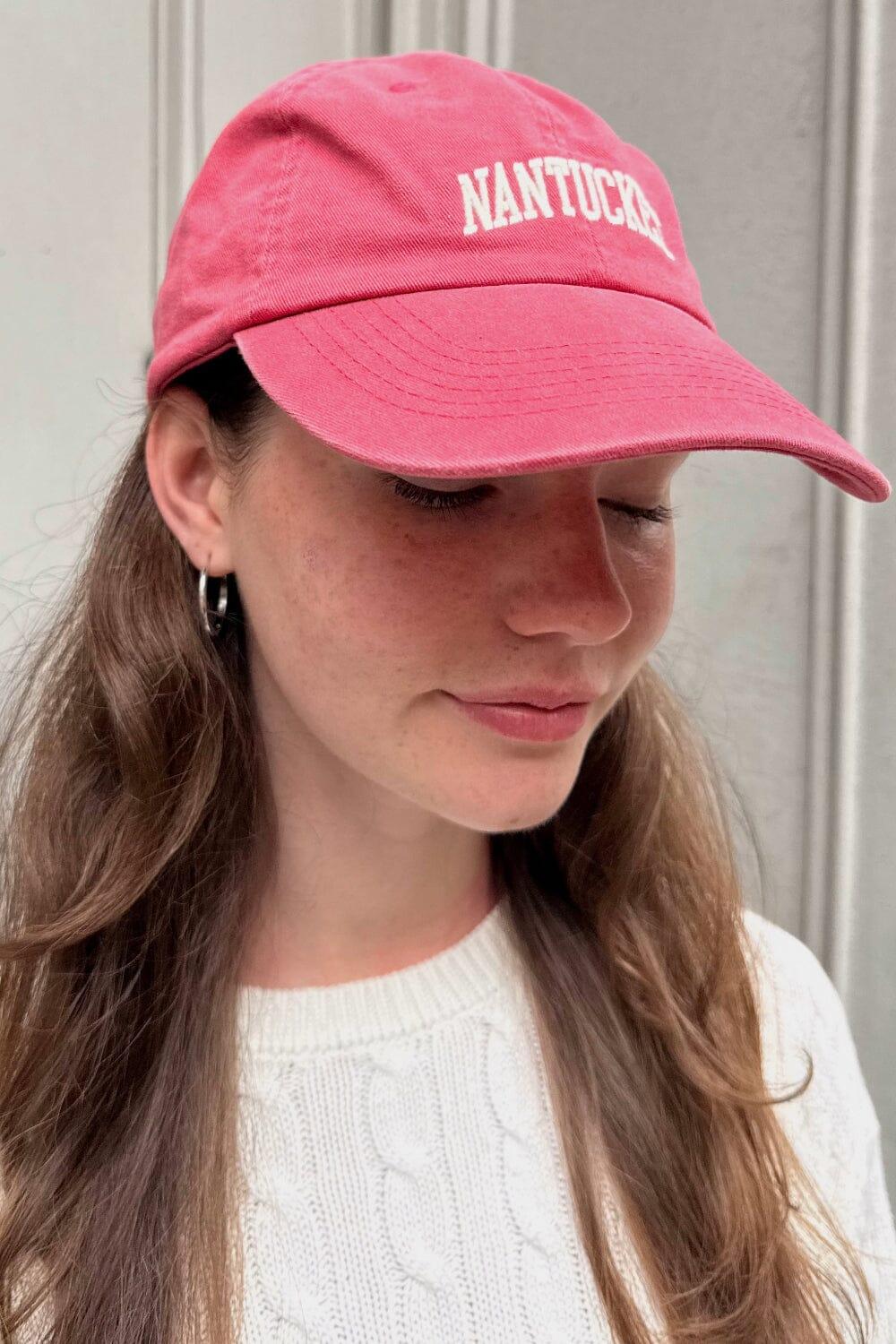 Faded red, six-panel, baseball cap with the Nantucket graphic embroidered in white. Adjustable in the back, exposed stitching on the brim.Fabrics: 100% cottonMeasurement: 3" (8 cm) brim length, 8.5" (22 cm) diameterMade In: China