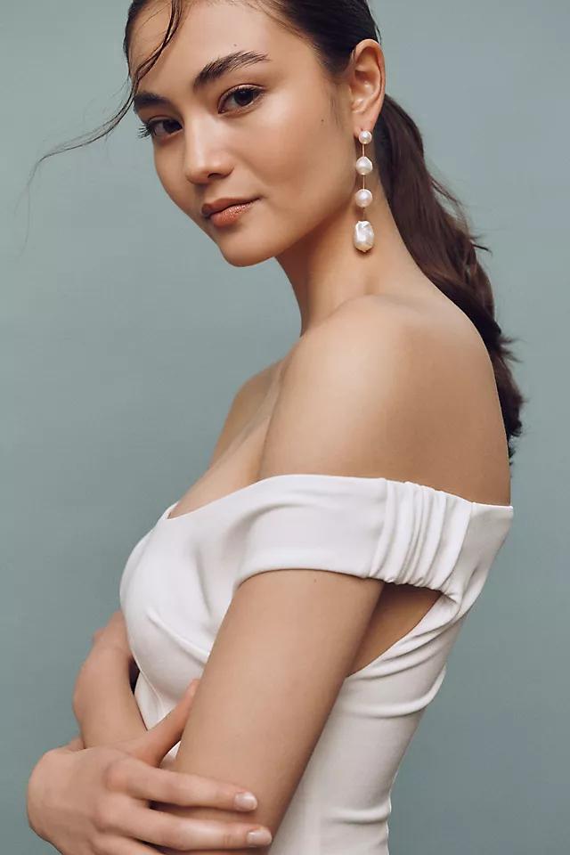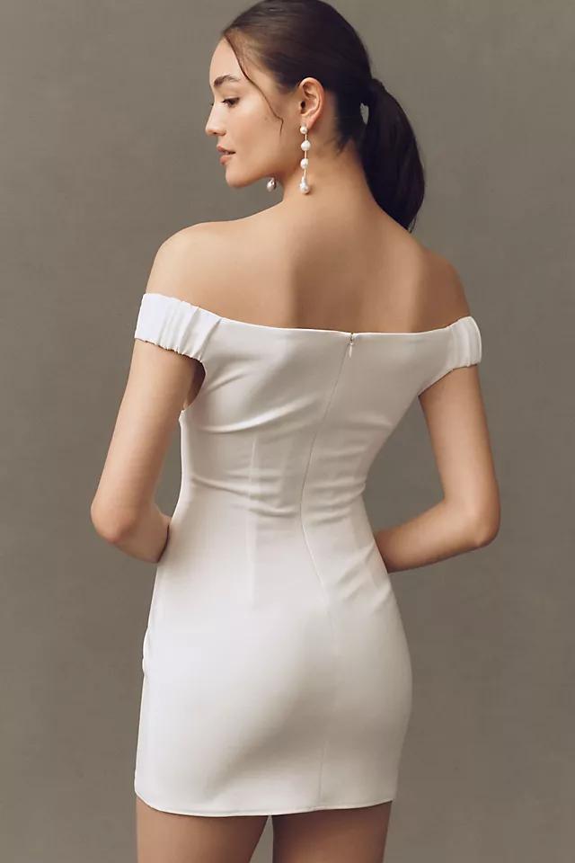 The Katie May Nanette Dress is an off-the-shoulder mini crafted from midweight crepe, featuring a boned bodice and a fully lined interior for a structured yet elegant fit.