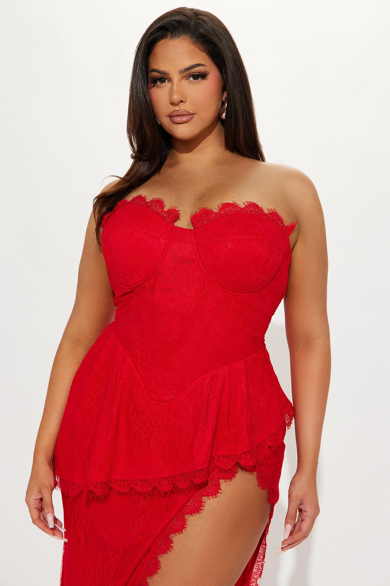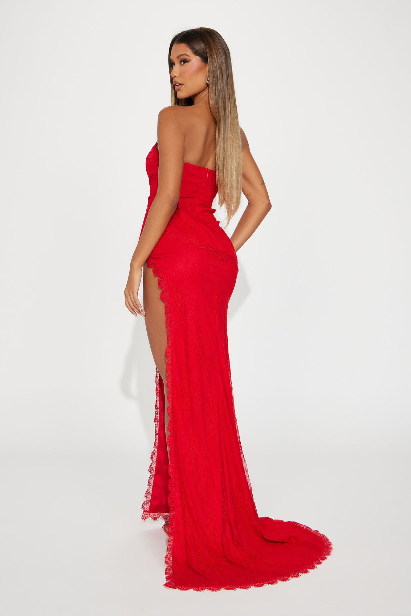 Available In Red And Blush. Lace Maxi Dress Strapless Sweetheart Neckline Padded Bra Cups w/ Underwire Corset Waist Peplum Waist High Slit Train Invisible Back Zipper No Stretch Shell 1: 100% Nylon Shell 2: 100% Nylon Lining: 92% Polyester 8% Spandex Imported