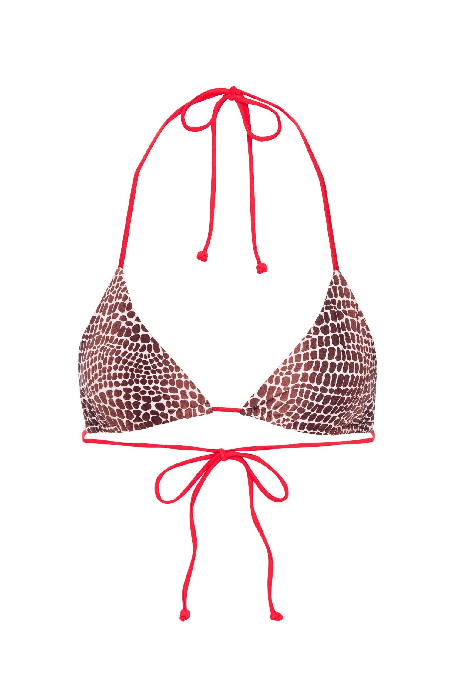 FOR PRE-ORDER. SHIPS ON OR AFTER JAN. 15 The Kauai Top gets an update. She's a stringy triangle bikini in Lizard that can be tied many ways for a perfect fit. Skimpy fit. Size up for more coverage.