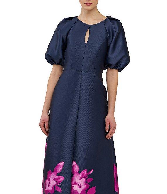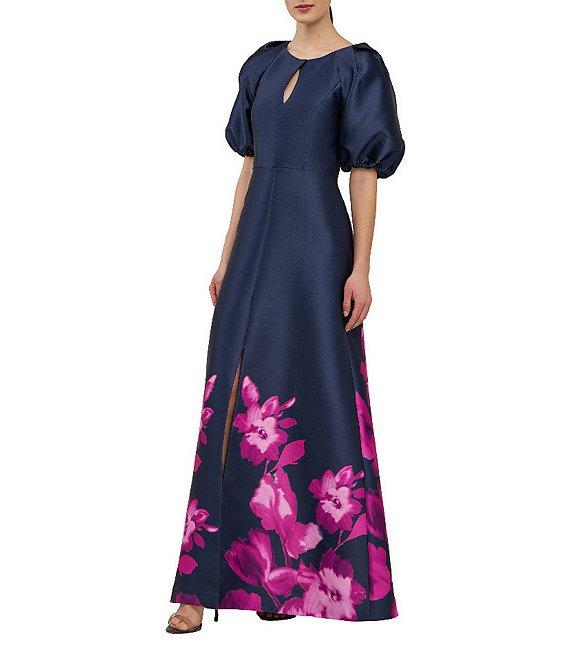 Kay Unger Delfina Floral Boarder Mikado Round Keyhole Neck Elbow Puff Sleeve Gown