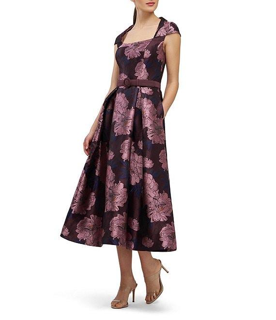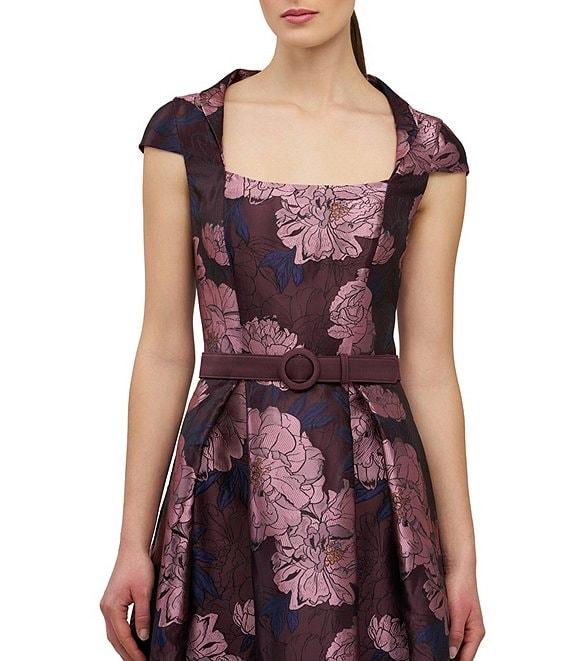 Kay Unger Floral Belted Jacquard Midi Dress