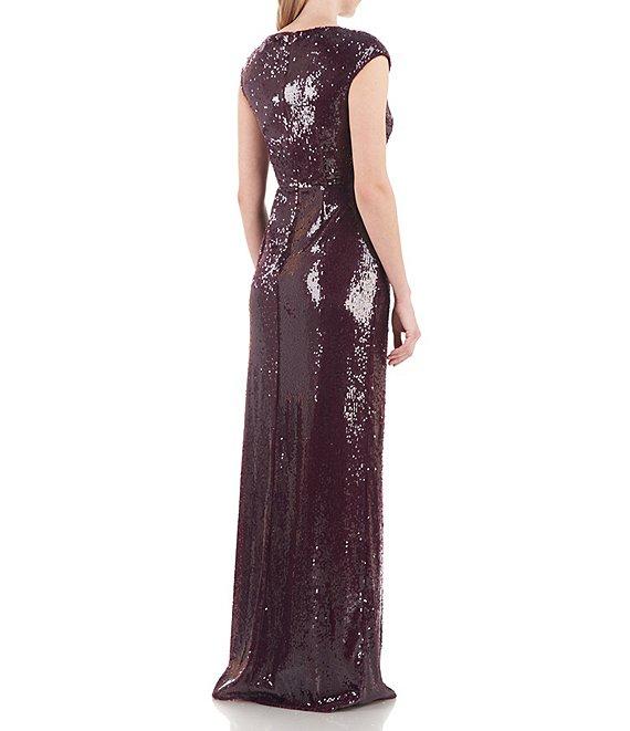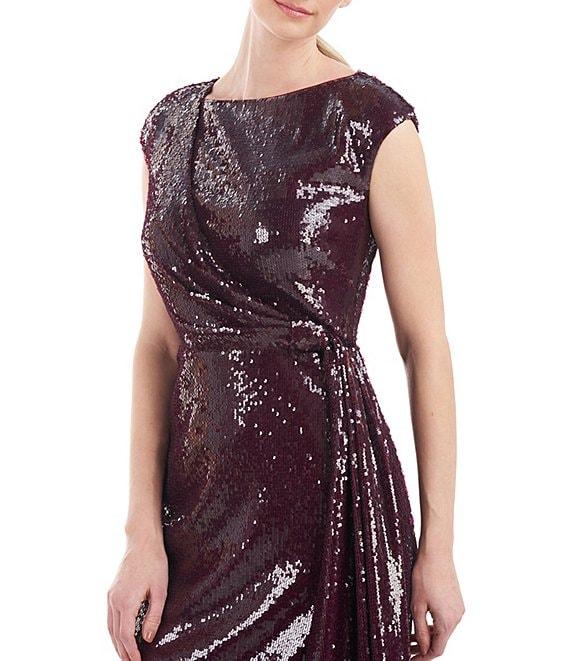 From Kay Unger, this gown features: All over sequin fabrication Sheath silhouette Boat neckline Cap sleeves Fully lined Center back zip closure Approx. 61" from hips Polyester Spot clean Imported.