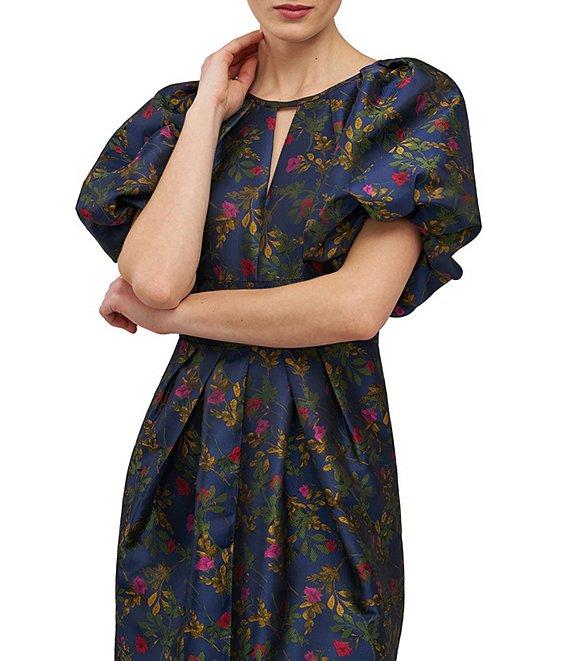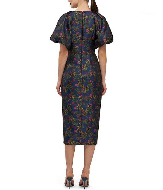 Kay Unger Jolie Jacquard Short Puff Sleeve Crew Neckline Sheath Midi Dress