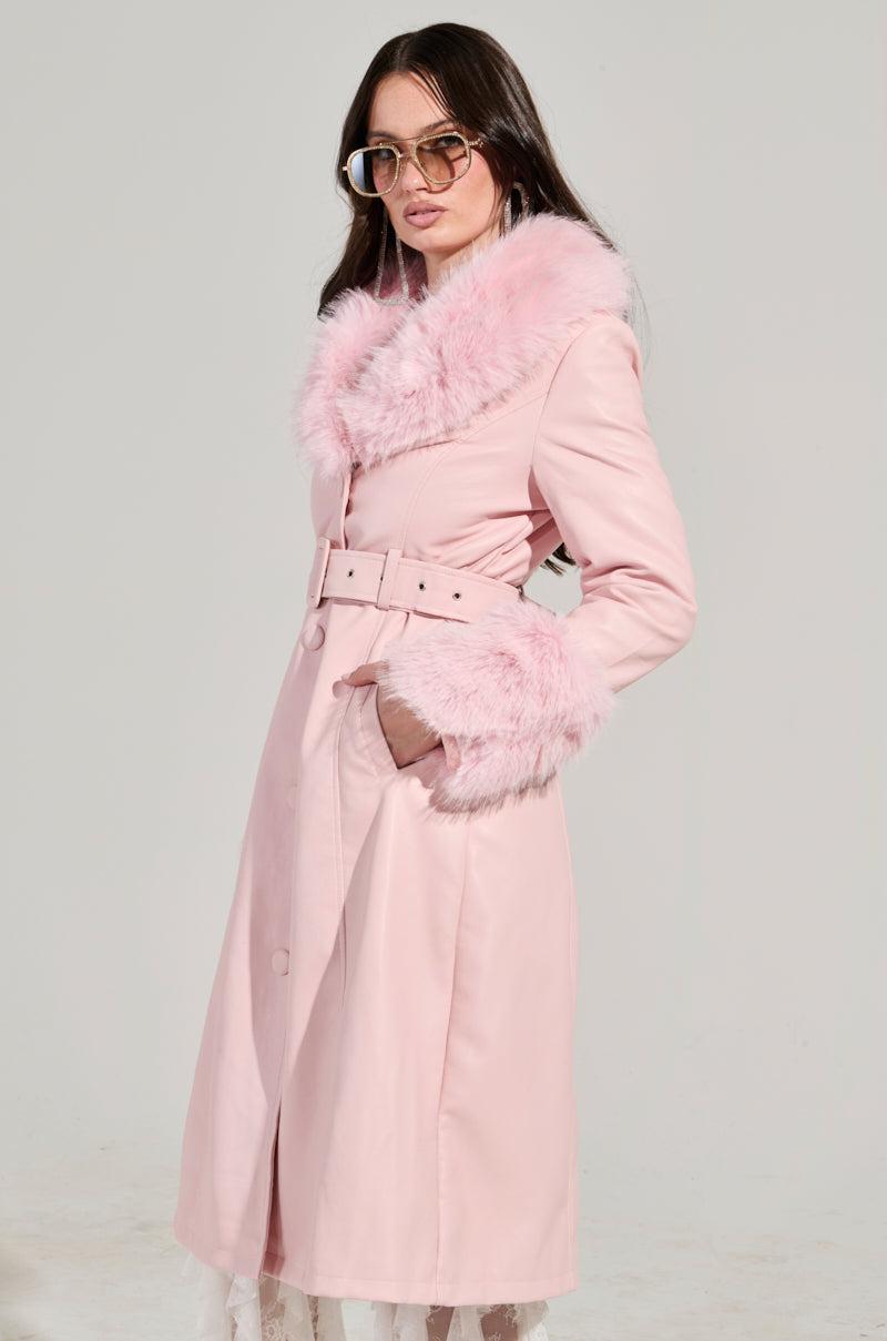 Paint the town pink with The AKIRA Label Kaya Fur Lined Trench In Light Pink. This sweet outerwear piece is crafted from a faux leather base and features a luxurious fold over faux fur collar, long sleeves with matching fur cuffs, functional belt loops with a tonal waist belt, side slant pockets, and a super cozy sherpa inner lining. Complete with vertical seam stitching, tonal button down front closures, and a longline silhouette. Pair with flared denim and stiletto booties for a finished look. - Fabric: 67% Polyurethane 20% Polyester 13% Viscose, Fur: 100% Polyester- Wipe With Damp Cloth- No Stretch- Imported (all measurements approximate from size small) - 42” Shoulder to Hem- 24” Sleeves- 16” Shoulder to ShoulderProduct ID: 433592 (all measurements approximate from size 1X)- 44” Shoulder to Hem- 25” Sleeves- 19” Shoulder to ShoulderProduct ID: 433596