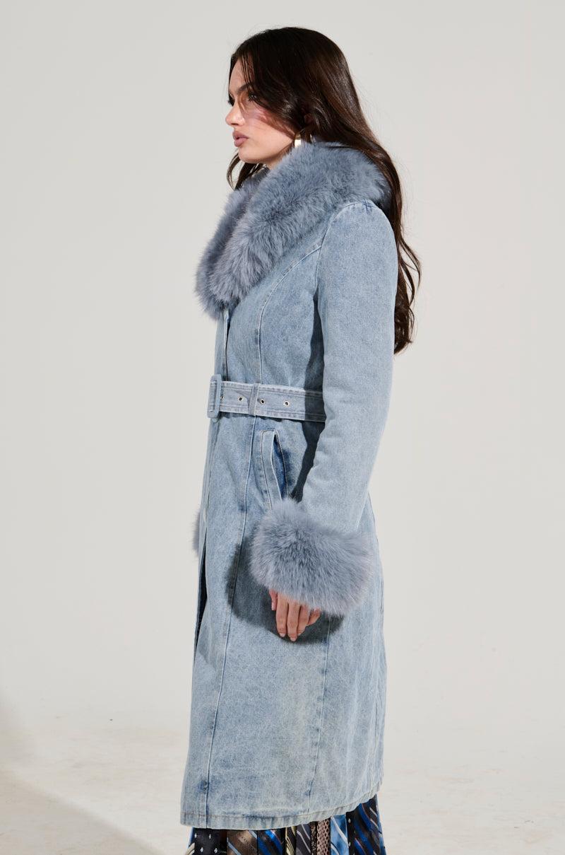 Luxury has never been so easy than in The AKIRA Label Hadley Mixed Media Trench. Crafted from a cotton blend denim base, this jacket features a luxurious tonal fold-over faux fur collar, long sleeves with matching fur cuffs, functional belt loops with a tonal waist belt, side slant pockets, and a super cozy sherpa inner lining. Complete with vertical seam stitching, tonal button down front closures, and a longline silhouette. Pair with flared leather pants and heeled boots for a finished look. - Fabric: 75% Cotton 25% Polyester, Lining: 100% Polyester- Hand Wash- No Stretch- Imported (all measurements approximate from size small) - 44” Shoulder to Hem- 24” Sleeves- 16” Shoulder to ShoulderProduct ID: 434032 (all measurements approximate from size 1X)- 46” Shoulder to Hem- 25” Sleeves- 19” Shoulder to ShoulderProduct ID: 434036
