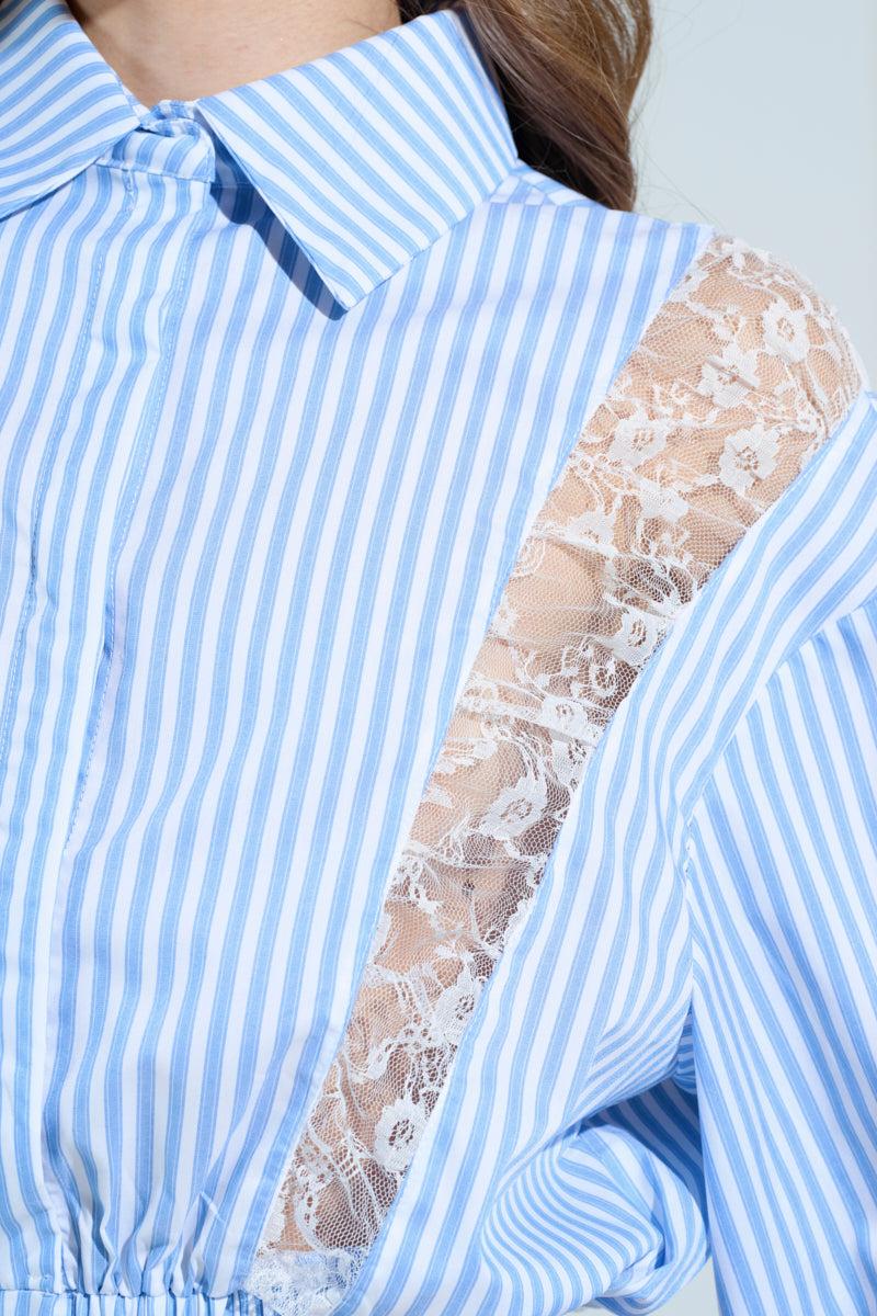 Sweet as can be in The Kaylee Lace Panel Button Down. This darling top is crafted from a lightweight, airy poplin base and features a classic striped pattern, a pointed collar, panels of sheer lace running the front and sleeves, long sleeves with snap button cuffs, and an elasticized, cinched bottom hem. Complete with concealed snap button down front closures, and a boxy, cropped silhouette. Pair it with the matching AKIRA Label Kaylee Lace Trim Mini Skirt, ruffle ankle socks, and platform loafers for a polished look. - Shell 1: 95% Polyester 5% Spandex, Shell 2: 100% Polyester- Some Stretch- Imported (all measurements approximate from size small)- 18” Shoulder to Hem- 19” Shoulder to Shoulder- 23” Sleeves- Model is 5’9” and is wearing size smallProduct ID: 1023788 (all measurements approximate from size 1X)- 20” Shoulder to Hem- 21” Shoulder to Shoulder- 24” SleevesProduct ID: 1023792