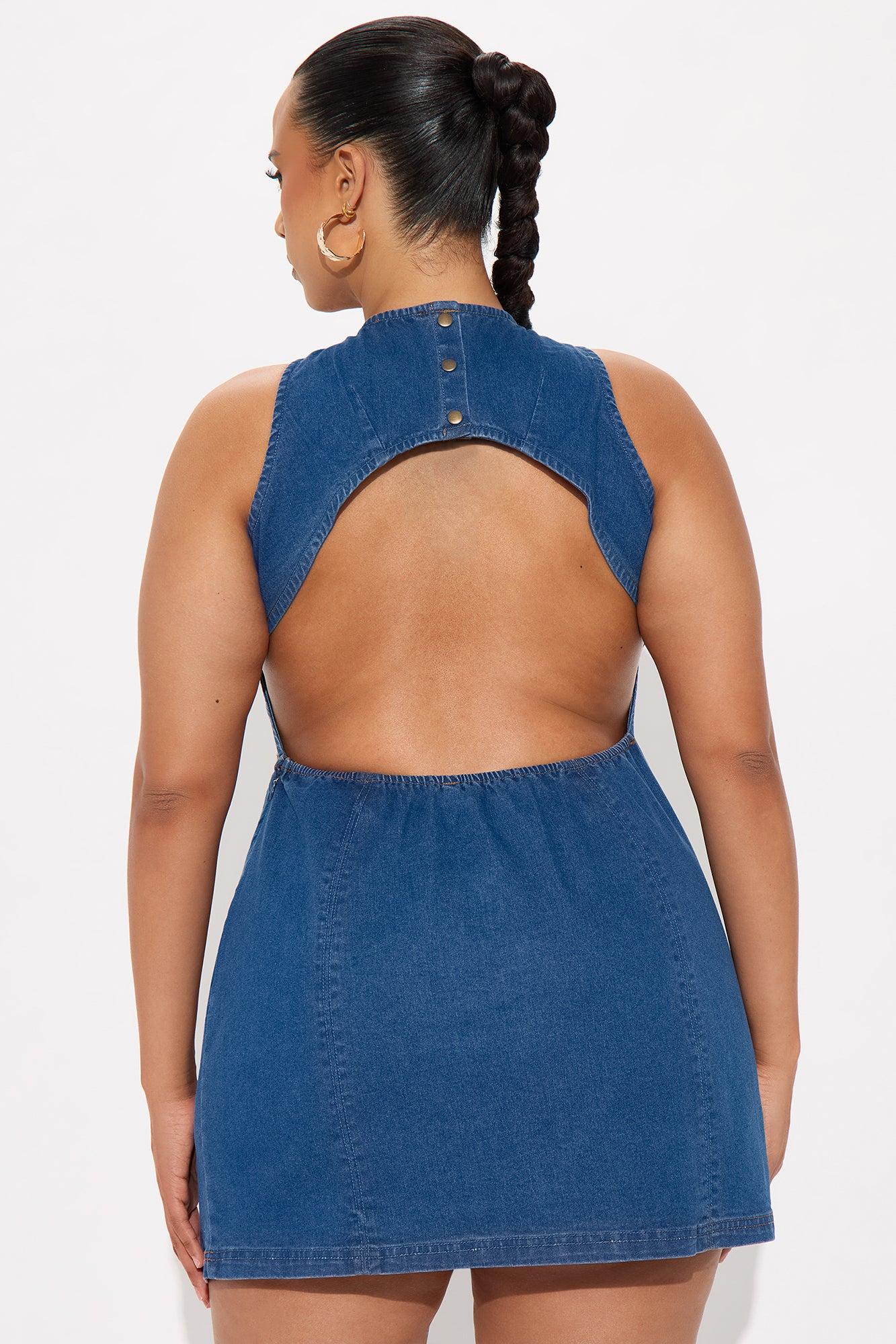 Available In White Wash And Dark Denim. Denim Mini Dress High Neckline Sleeveless Open Back Button Closure Side Zipper Stretch 80.8% Cotton 16.2% Polyester 3% Spandex Imported
