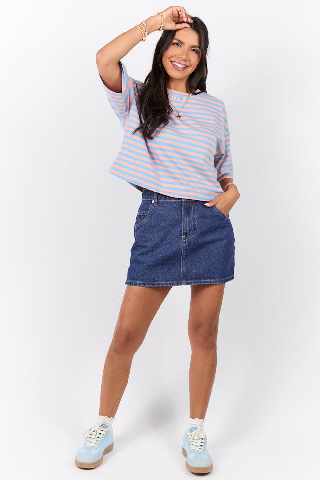 Details Boxy Striped Tee Blue/Coral Multi Fabric has stretch Crew neckline,, short sleeves Unlined Size small from shoulder to hem: 17" Material and Care 95% cotton 5% elastane Machine wash cold, no drum drying Patterns may vary Materials may have natural variations Colors may vary from different viewing devices.