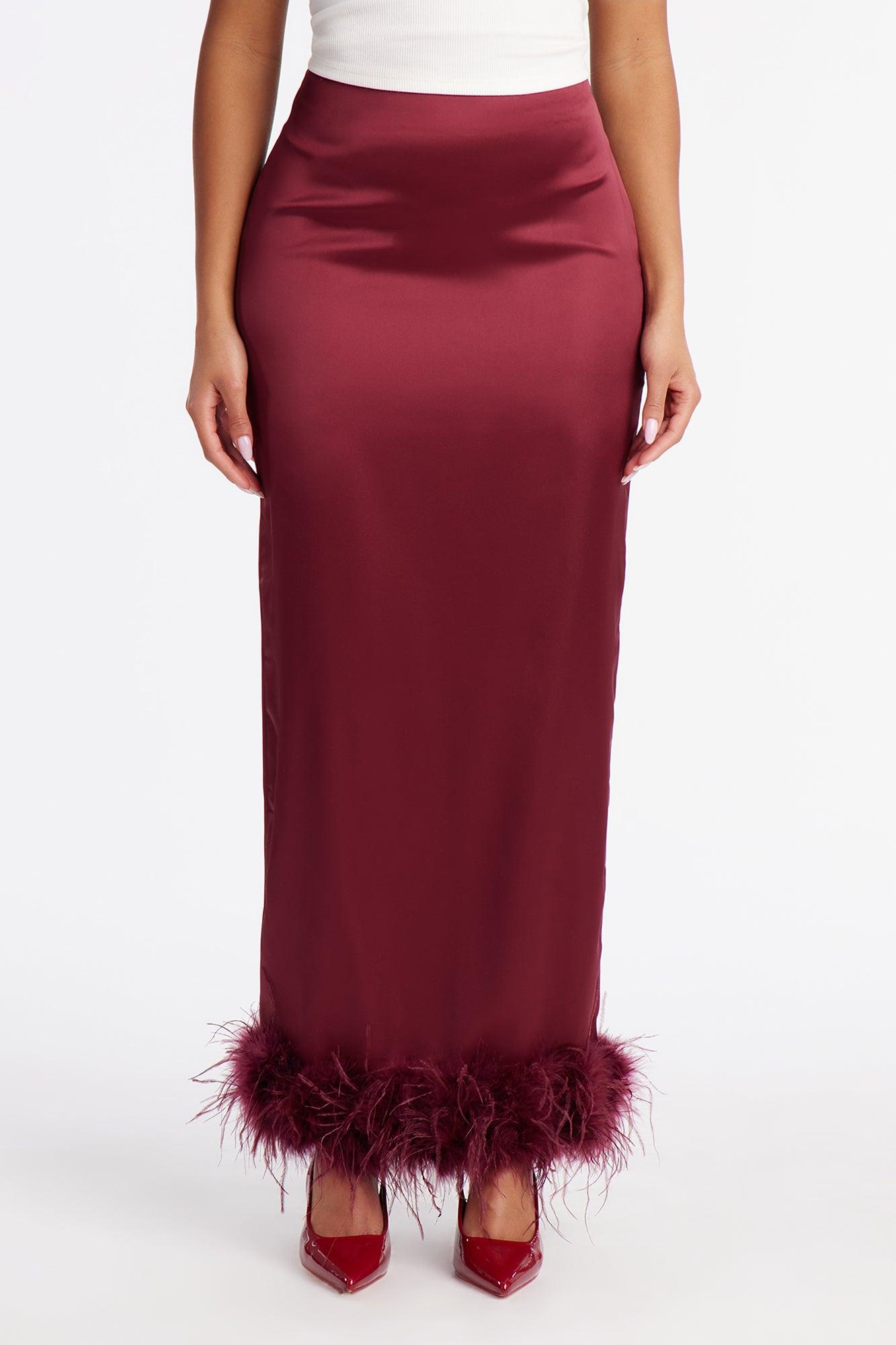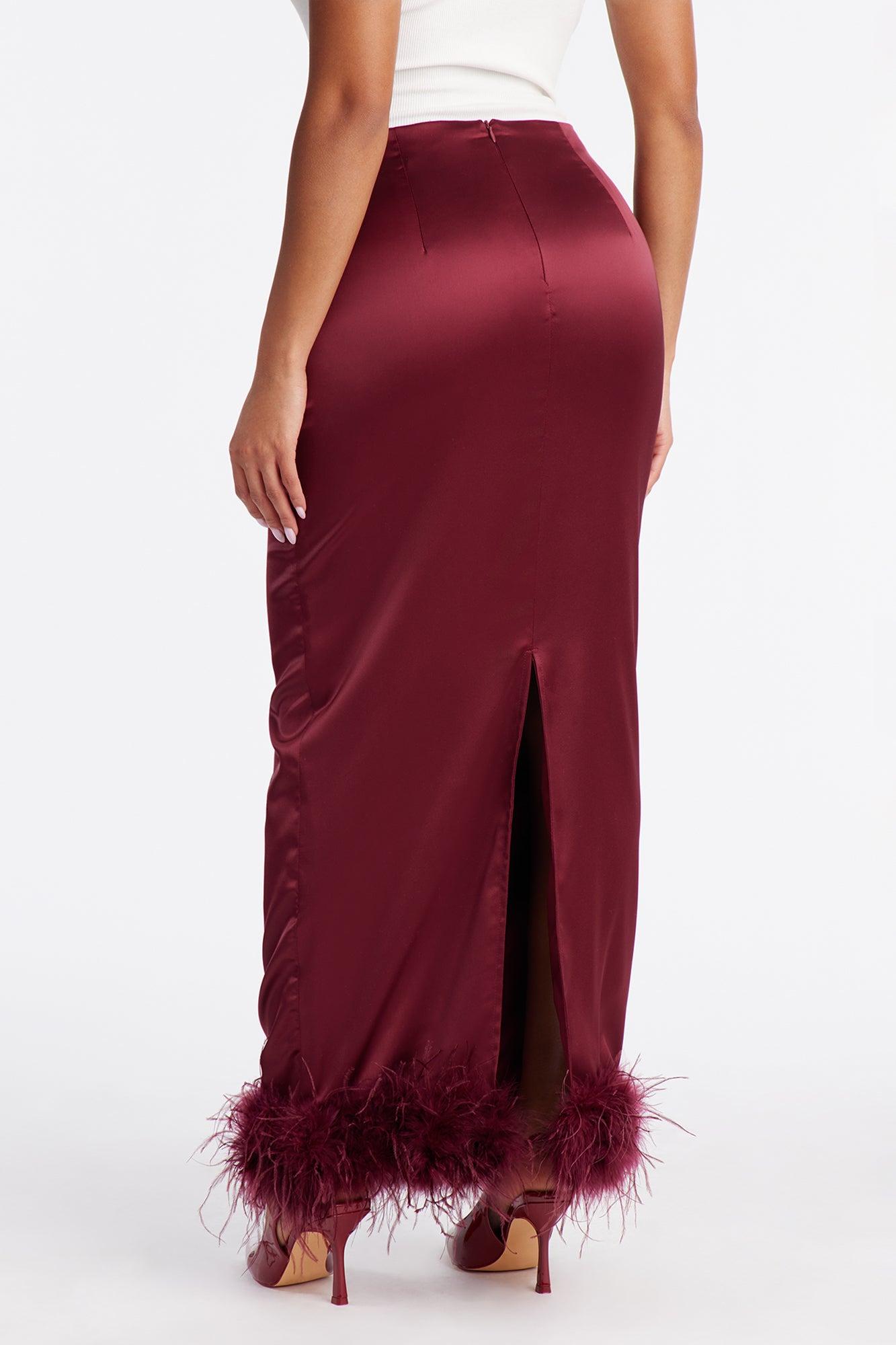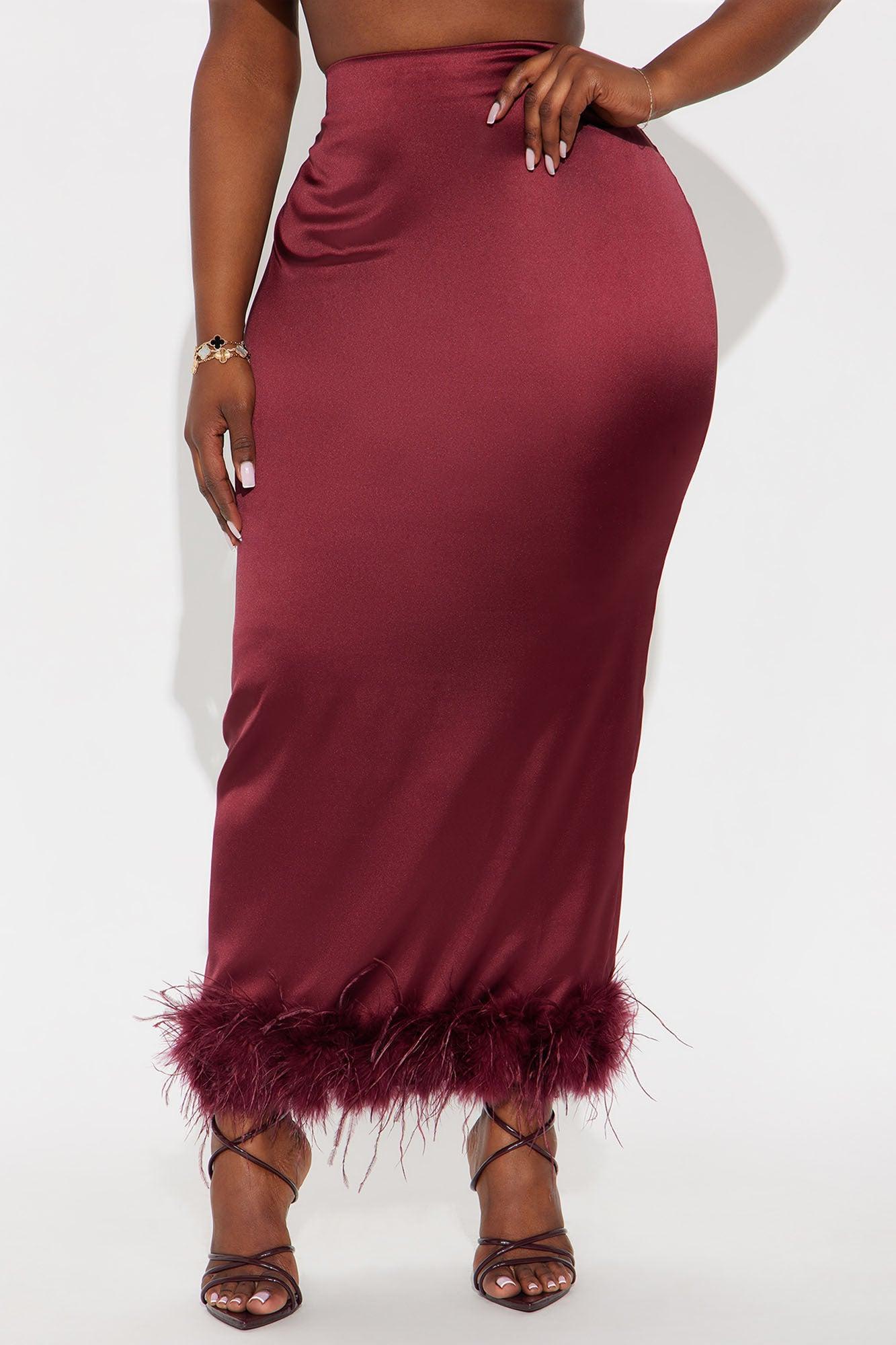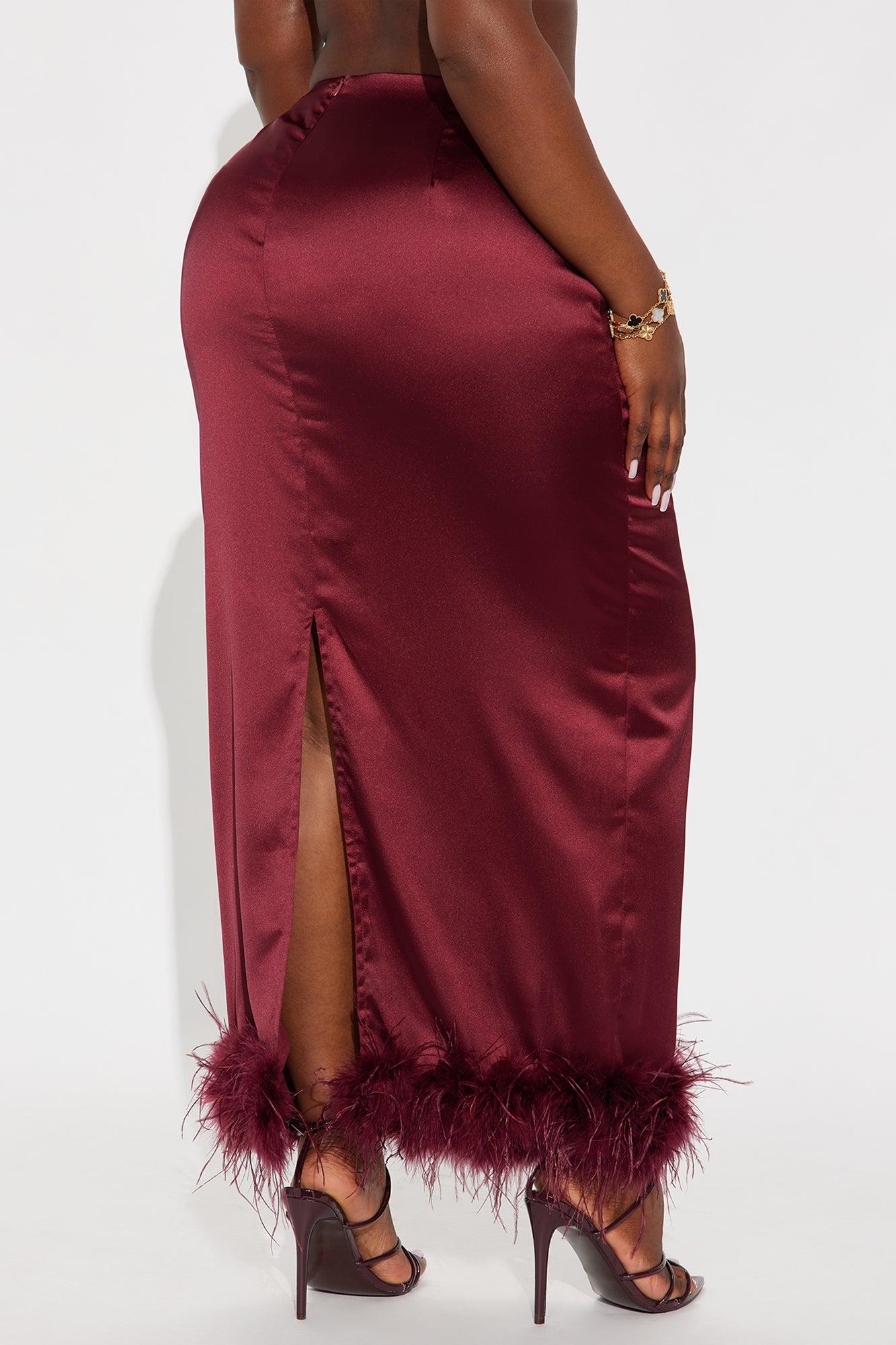 Keep It Classy Satin Feathered Maxi Skirt - Burgundy Female