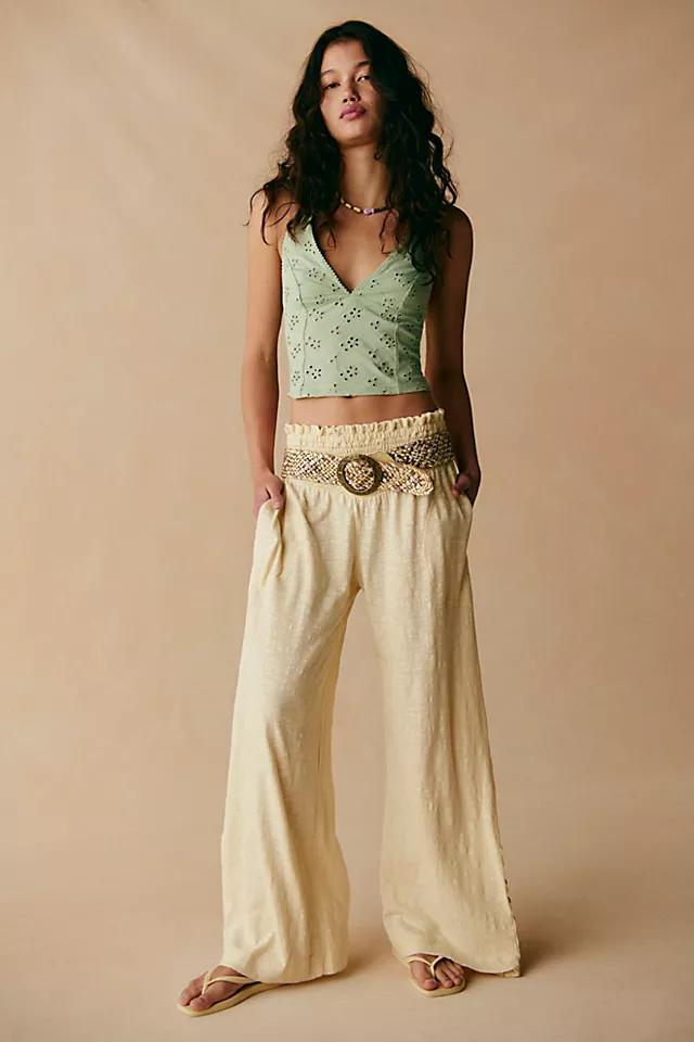 **Features:** Top: Slit hem feature, dropped armholes, twisted border detailing; Pants: Pointed smocked waistband, button-up detailing at hem, side pockets