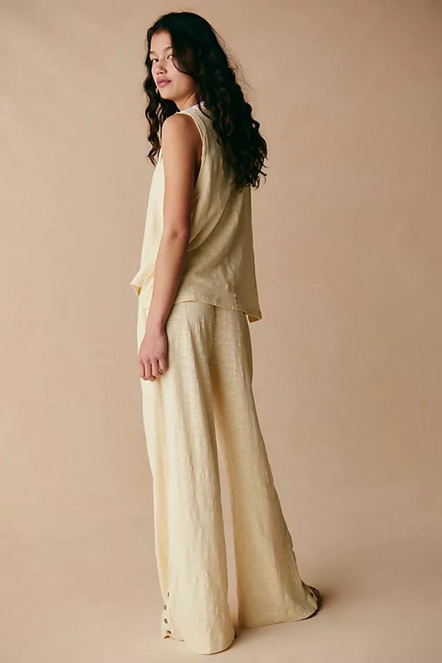 **Fit:** Top: Relaxed, V-neck silhouette with longer back hem; Pants: High-rise, billowy wide-leg silhouette