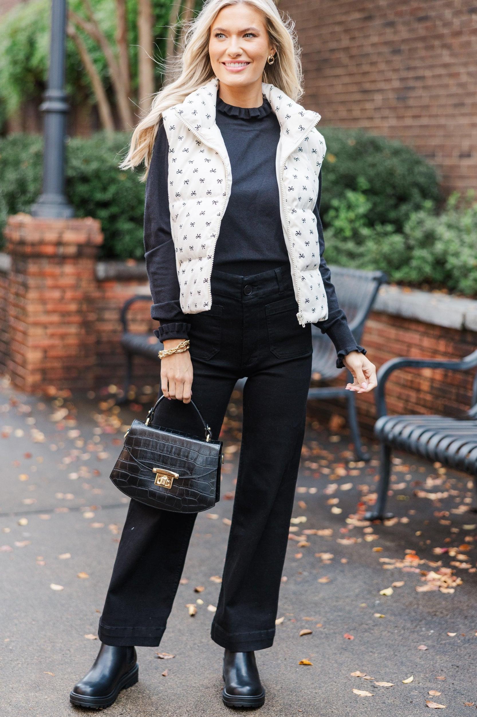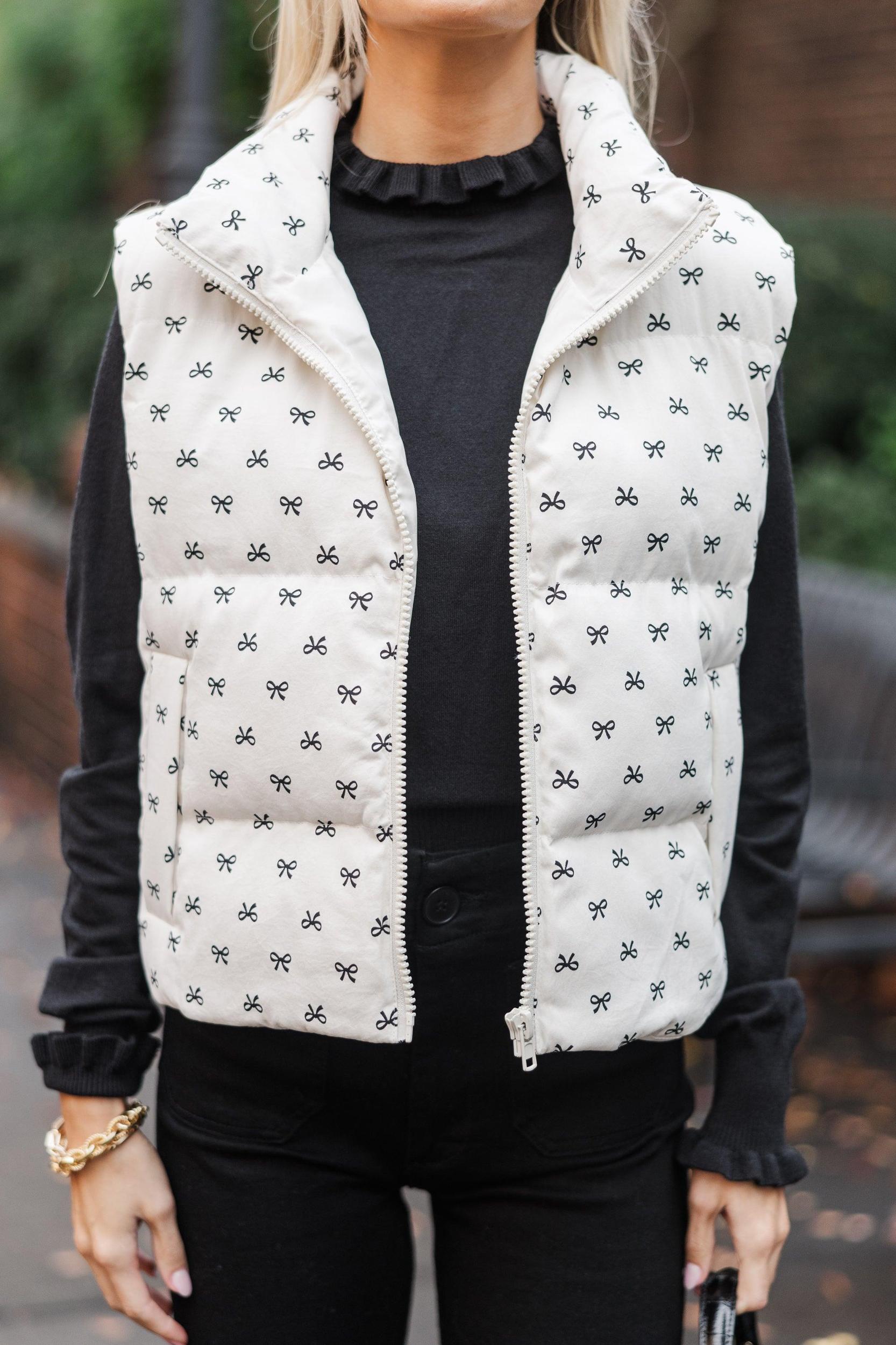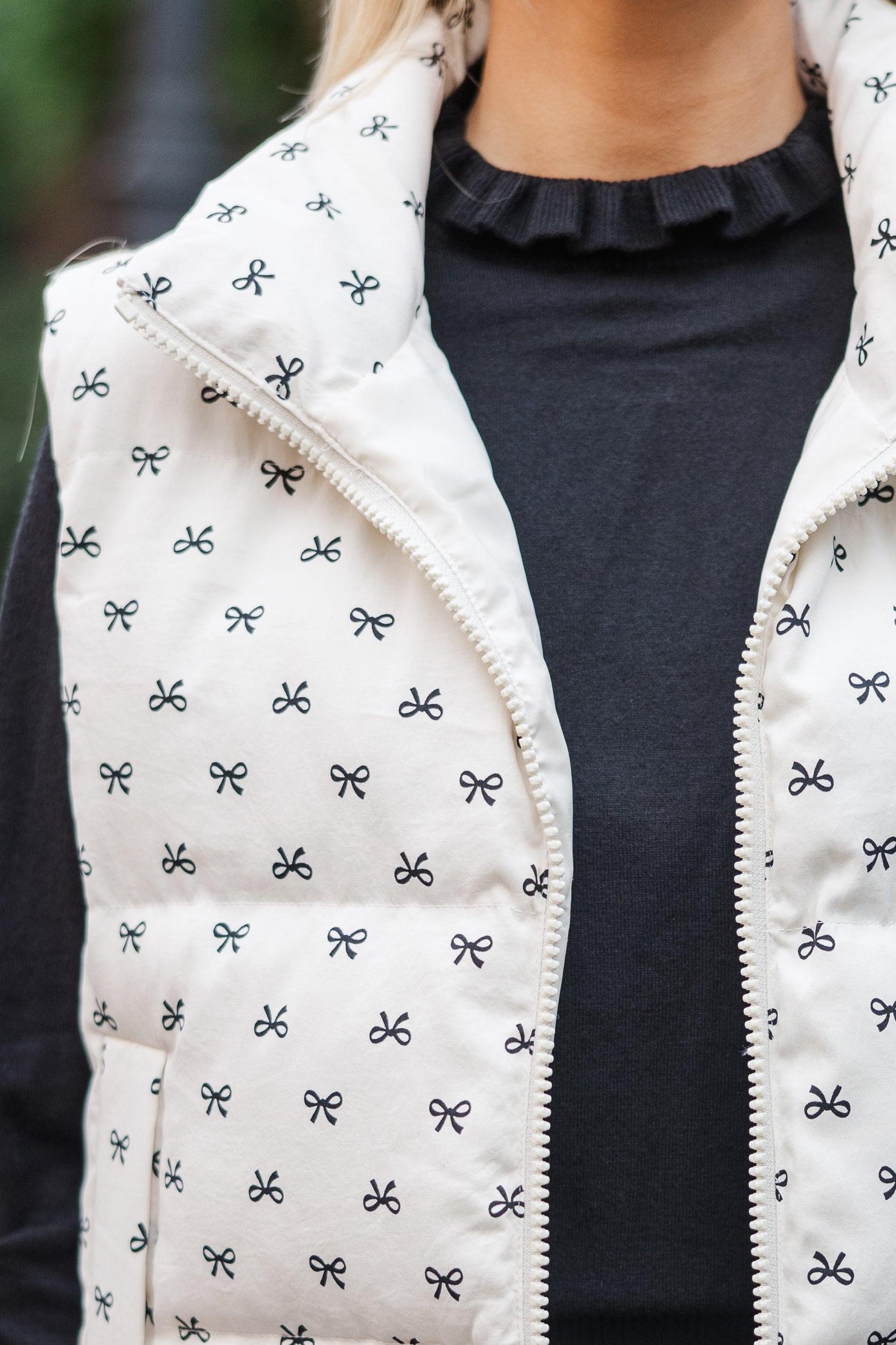 We love a puffer vest this time of year! But this one really takes the cake! That tiny bow print is just so precious! This puffer vest is not only adorable but that design is sure to keep you nice and warm! Collared neckline Zip front closure Puffer style Bow print No stretch Baileigh is wearing the small.