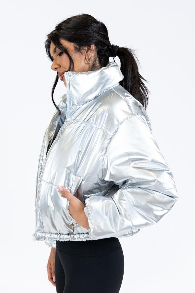 Details Silver Chrome Puffer Jacket Fabric has no stretch Collared style, functional zip up closure, functional pockets, elastic waistband Pair this jacket over a cute sweater dress! Lined Size small from shoulder to hem: 17.5" Material and Care Fabric: 50% polyester 50% polyurethane Lining: 95% polyester 5% elastane Padding: 100% polyester Machine wash cold, no drum drying Patterns may vary Materials may have natural variations Colors may vary from different viewing devices.