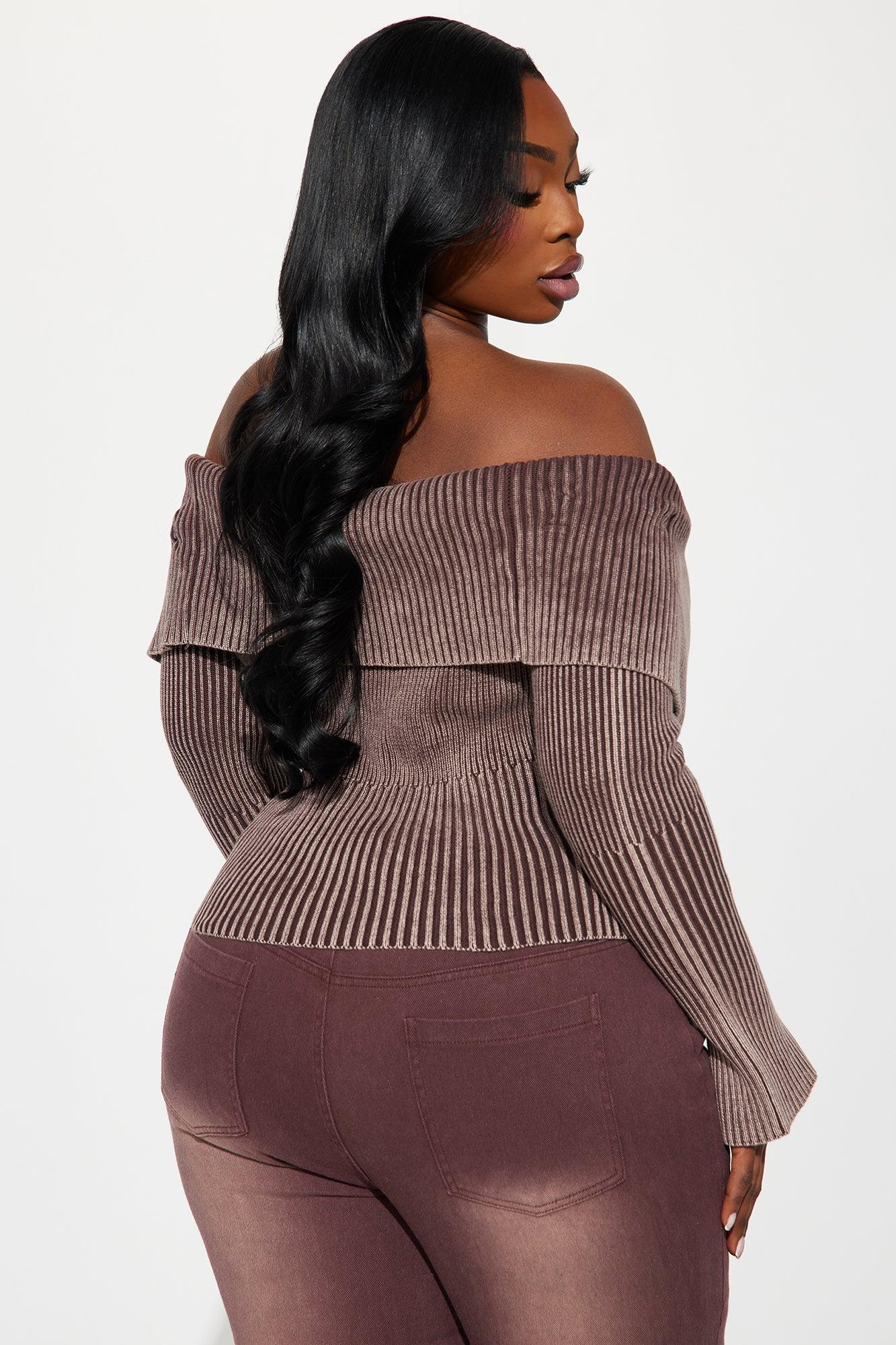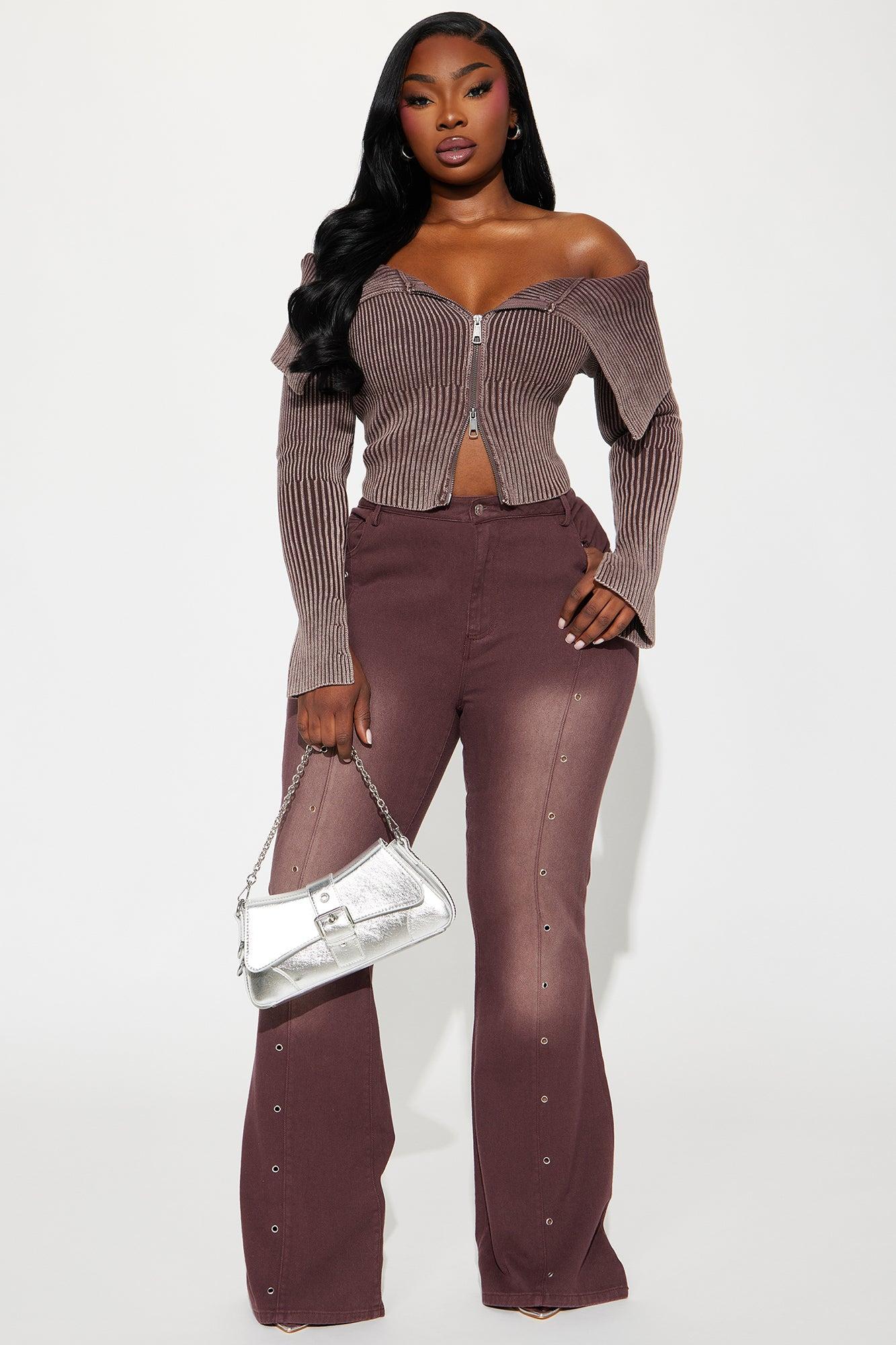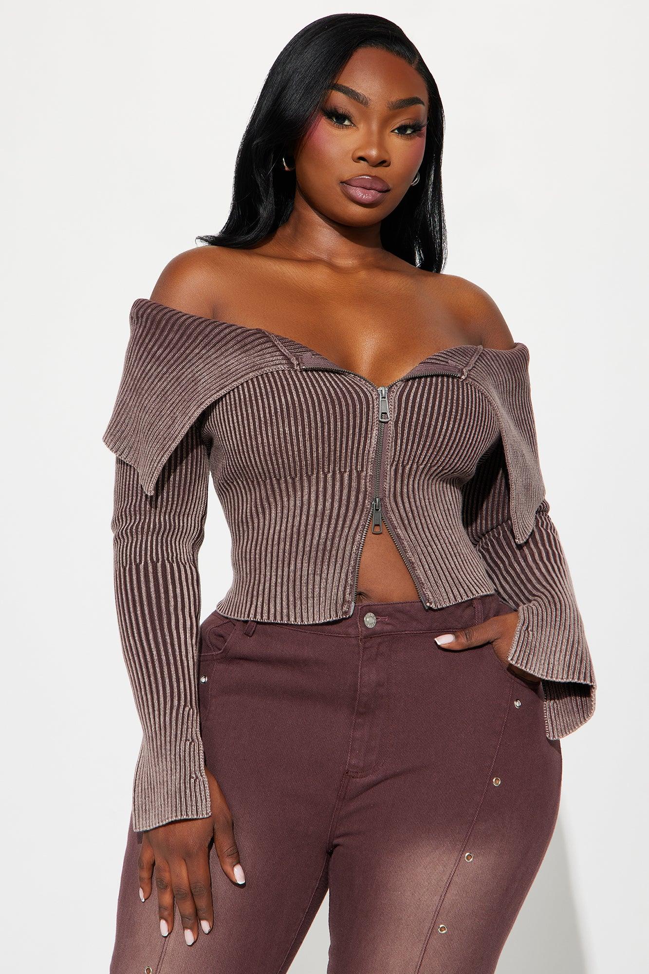 Available In Brown. Cardigan Sweater Washed Long Sleeve Off Shoulder Fold Over Detail Front Zipper Ribbed Cropped Disclaimer: Due To The Specialized Wash Process, Each Garment Is Unique. 100% Cotton Imported