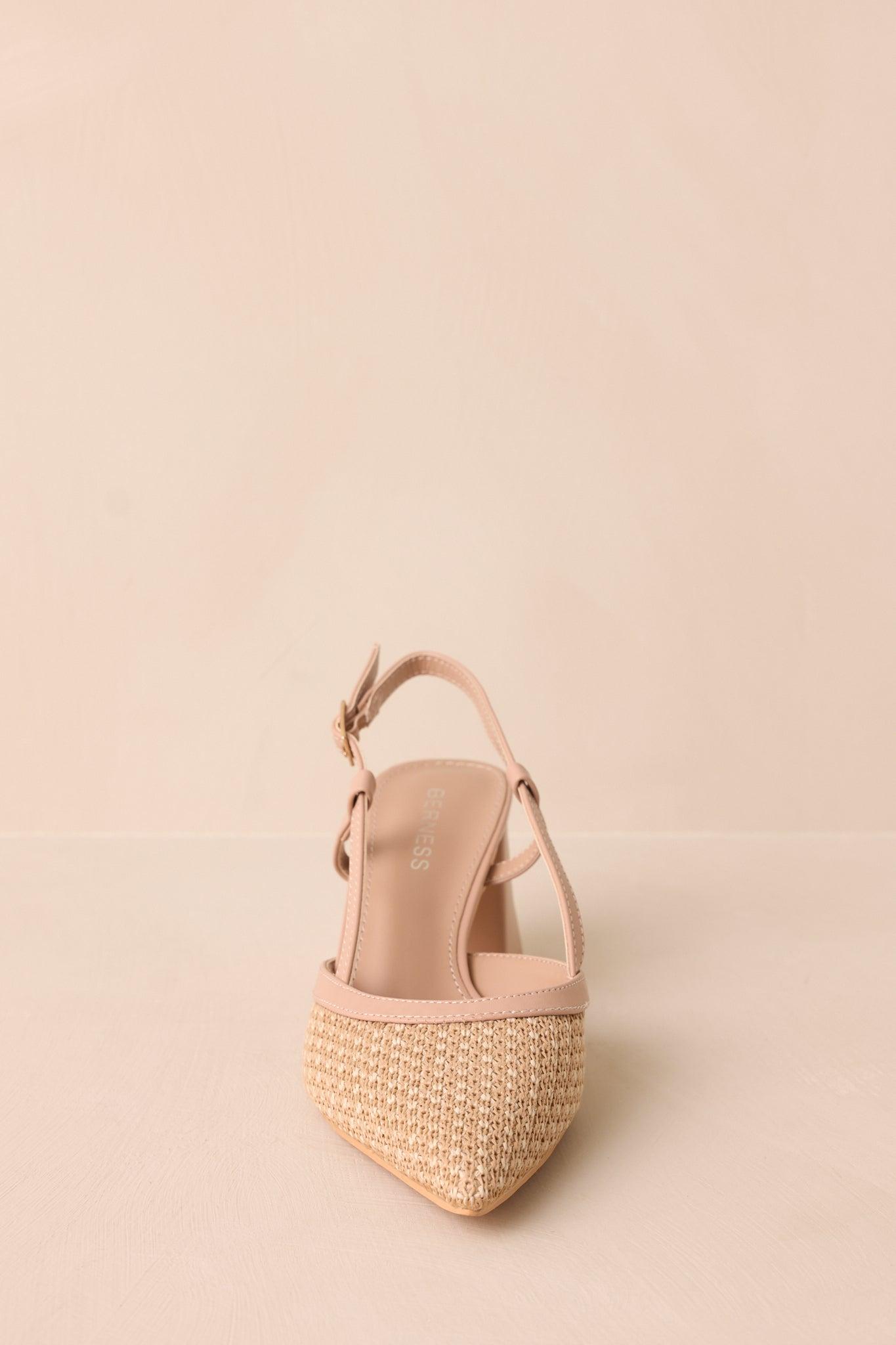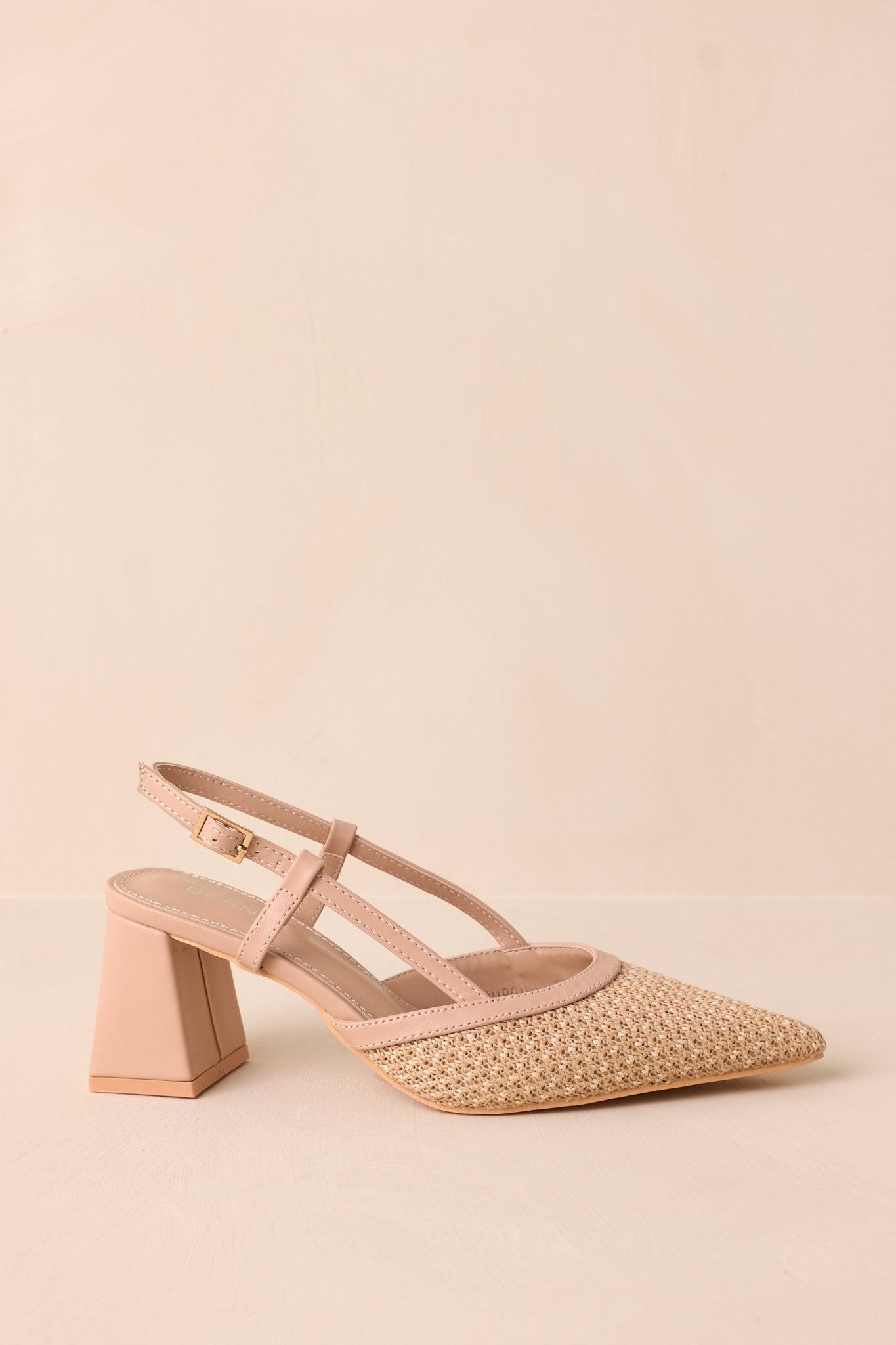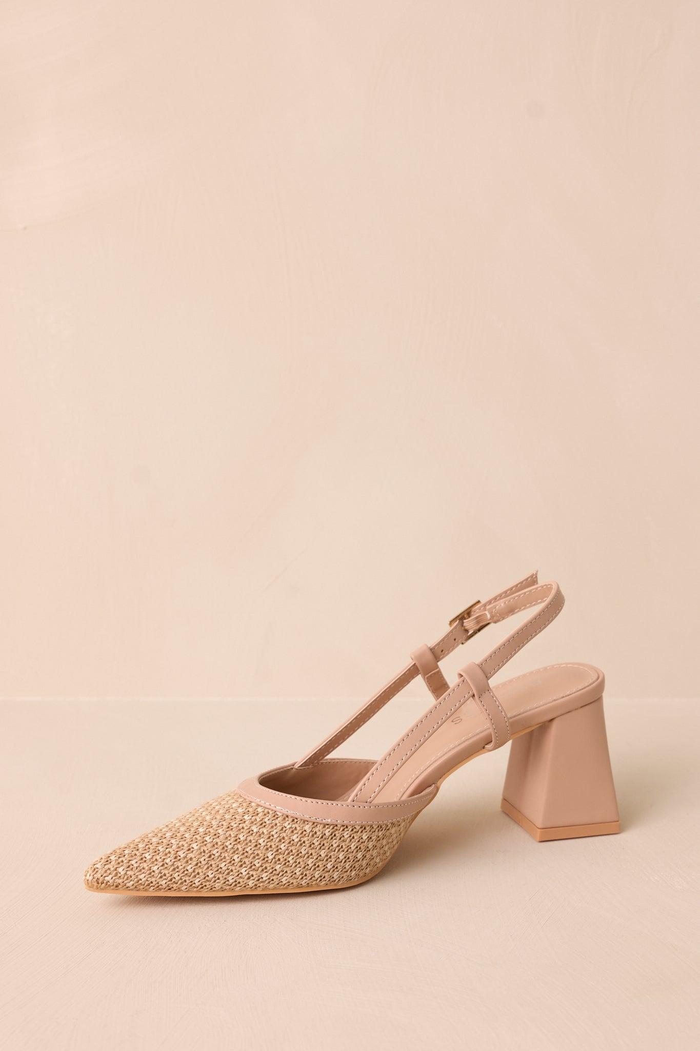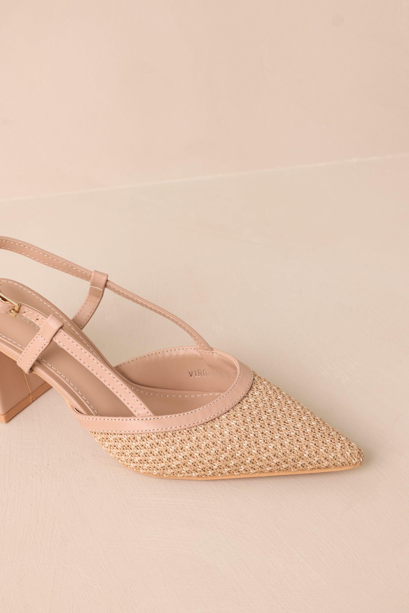 Elevate your style game with our Keeping It Real Beige Woven Pointed-Toe Slingback Heels. The elegant woven design and pointed-toe silhouette are perfect for adding a touch of sophistication to any outfit. The slingback strap provides a secure and comfortable fit, while the beige color adds versatility for any occasion. Elevate your confidence with these timeless heels. These beige woven heels feature a pointed toe, a woven straw material on the toe box, a solid beige slingback strap, a gold square buckle on the strap, a thick solid beige block heel and cushioning in the sole.