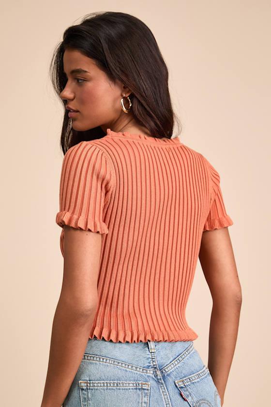 With a comfy ribbed sweater knit and an effortless, feminine aesthetic, you'll constantly reach for this versatile top to create endlessly cute OOTDs. Pair the flattering V-neckline with your favorite layered jewelry, accentuating the fitted, button-front bodice framed by classic short sleeves. Flirty ruffles trim the neckline, cuffs, and slightly cropped hem.