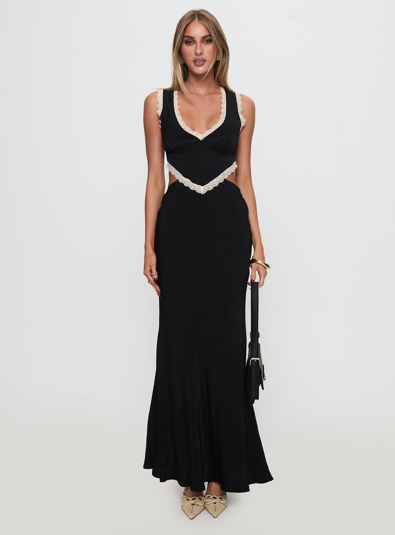 Lace trim maxi dress Satin material, scooped neckline, ruched bust, cut-out at waist, invisible zipper on side, exposed back Non-stretch material, fully lined Main: 92% rayon 8% elastane, Lining: 100% cotton Cold gentle machine wash