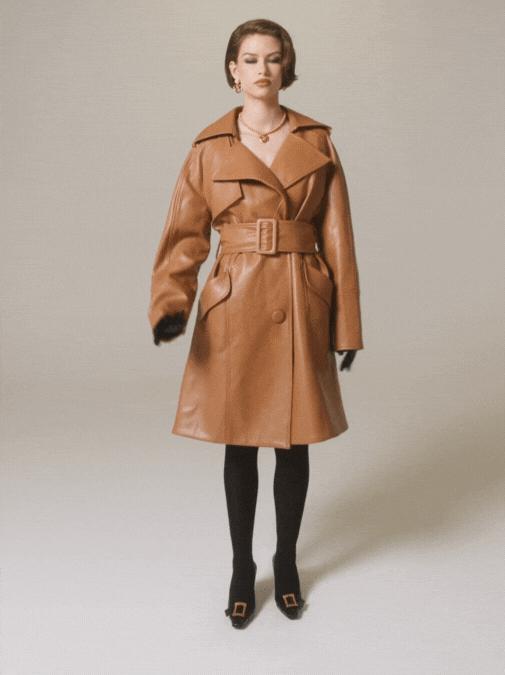 Invest in a smooth, buttery soft leather trench for all your daily errands. The Keira Trench Coat is made of high-quality, environmentally-friendly leather and reaches the knee for a true trench experience. The fabric is soft to the touch and durable, to serve you all season long. Leather trench coat Windbreaker material Knee-length Wide belt with buckle Dry clean only