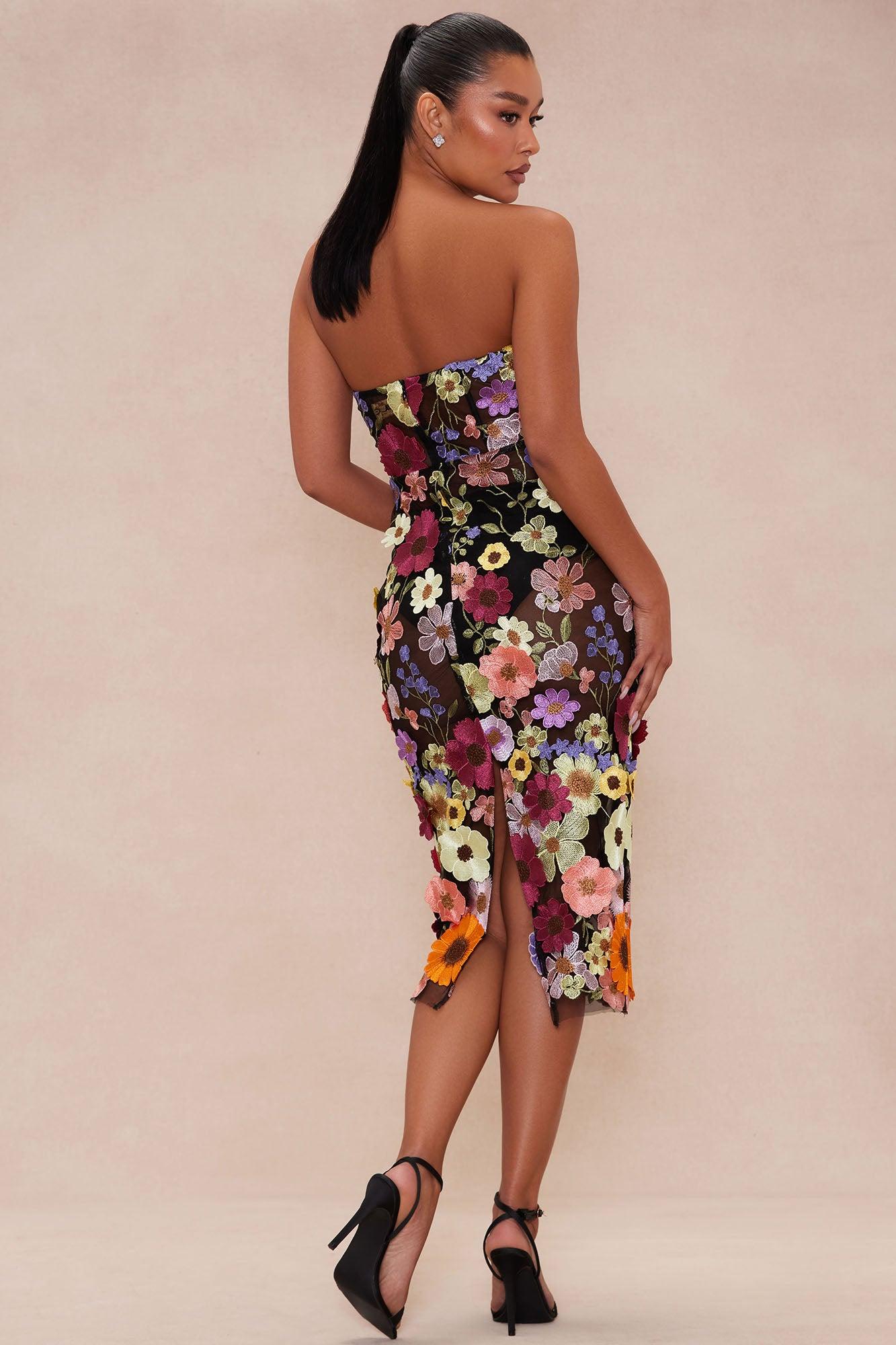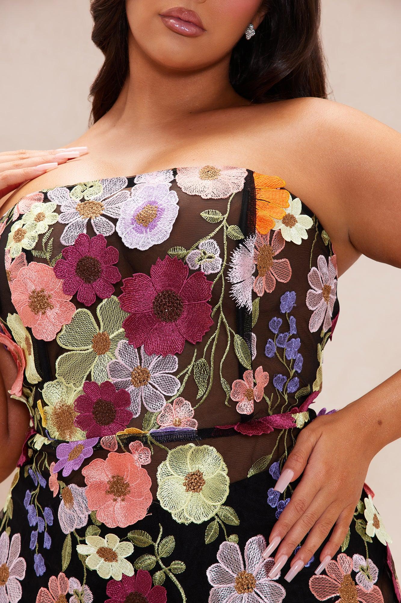 Available In Black/combo. Floral Embroidered Midi Dress Strapless Center Back Zipper Black Panty Liner Non Stretch Disclaimer: Due To The Embroidery Placement , Each Garment Is Unique. Shell: 100% Polyester Lining: 100% Polyester Underwear: 95% Polyester 5% Spandex Imported California Proposition 65WARNING: Cancer and Reproductive Harm - www.P65Warnings.ca.gov.