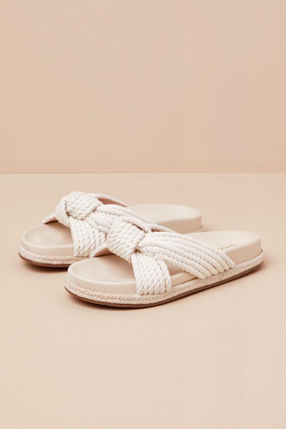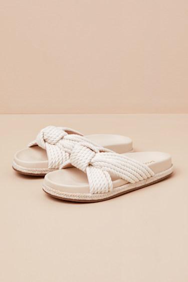 Paired best with a seaside breeze and a stroll through the palms, these effortless sandals feature an open-toe upper and a classic slide-on silhouette. Raffia rope shapes a knotted vamp with cutouts at the sides atop a raffia-wrapped sole. Contoured insole. Available on whole sizes only.