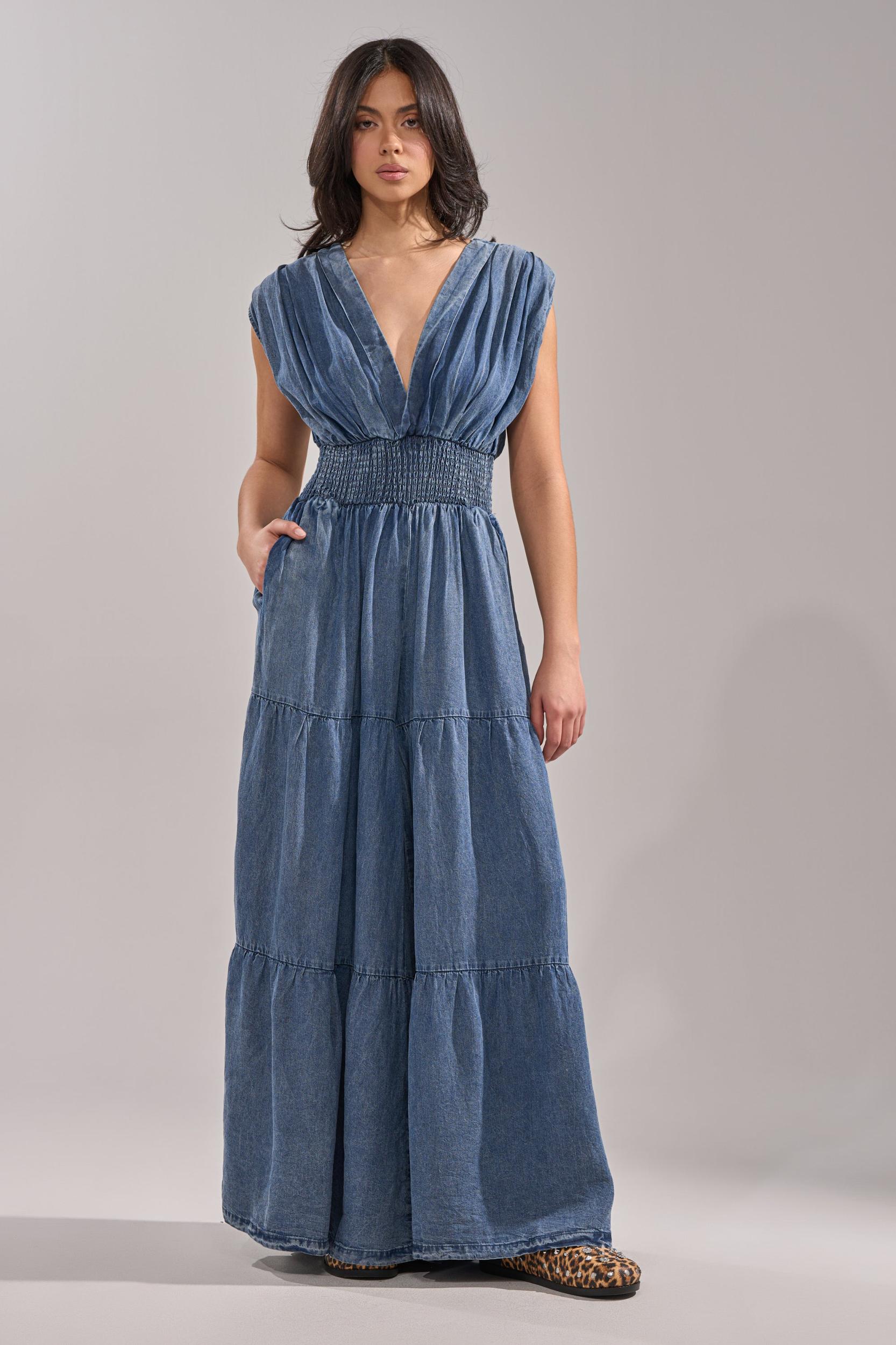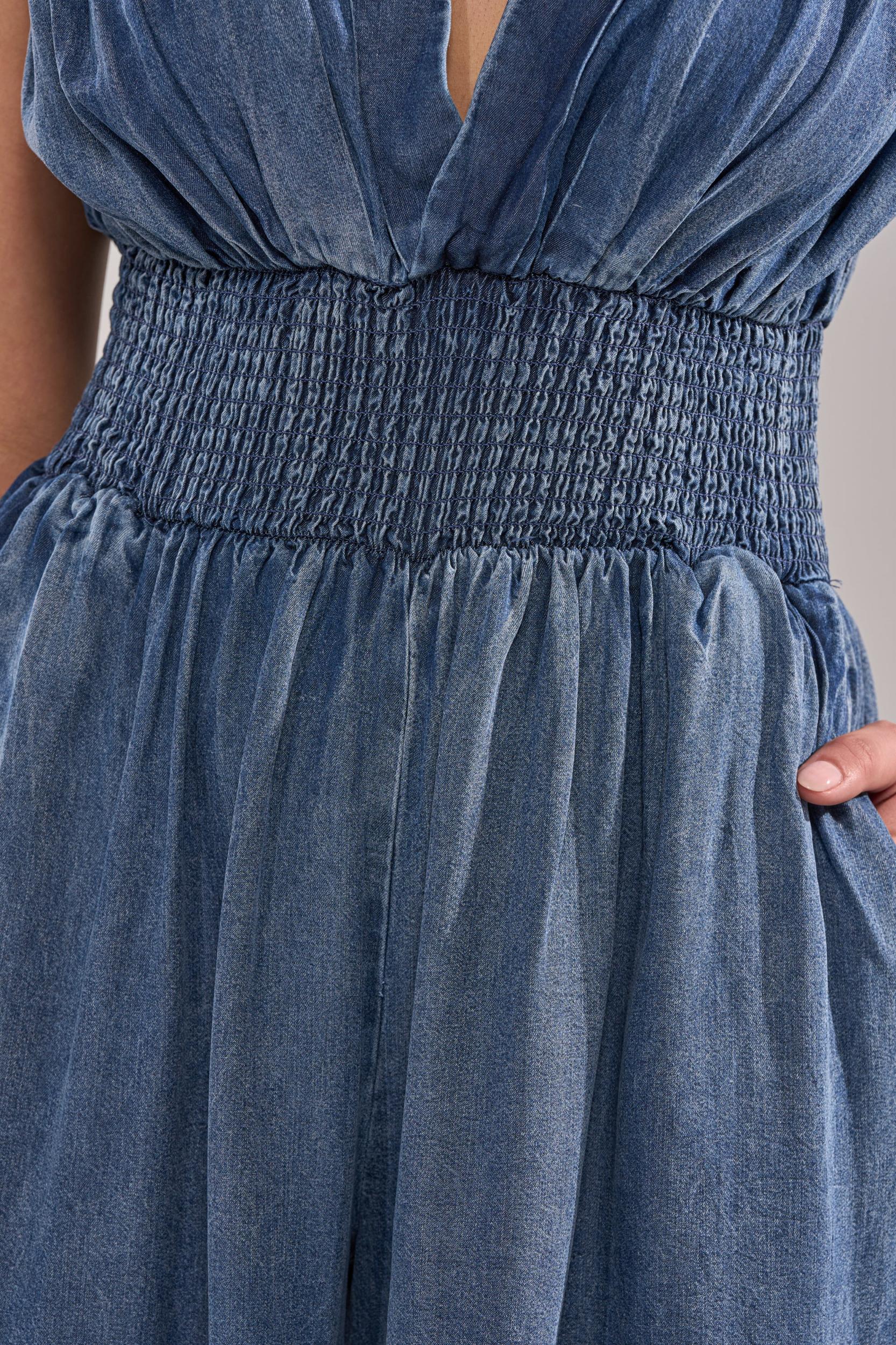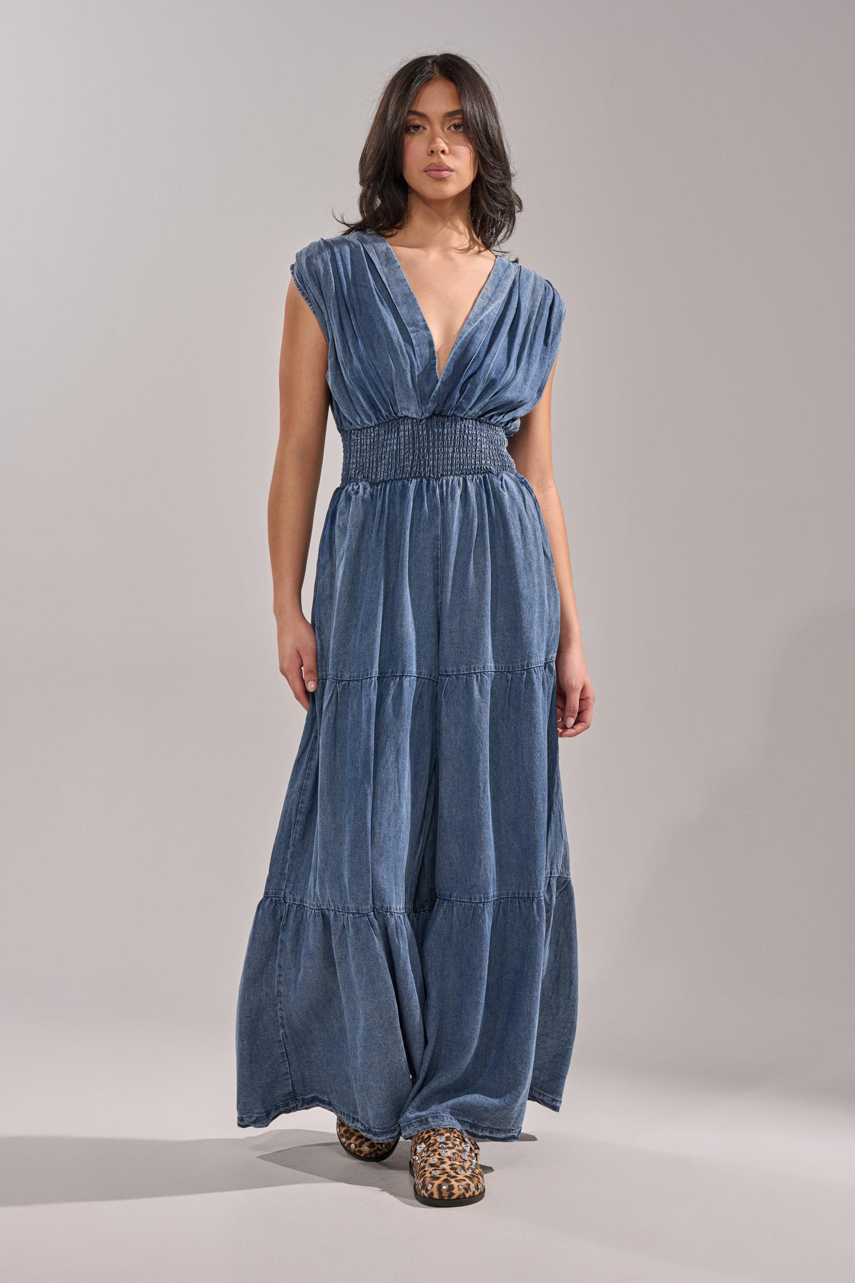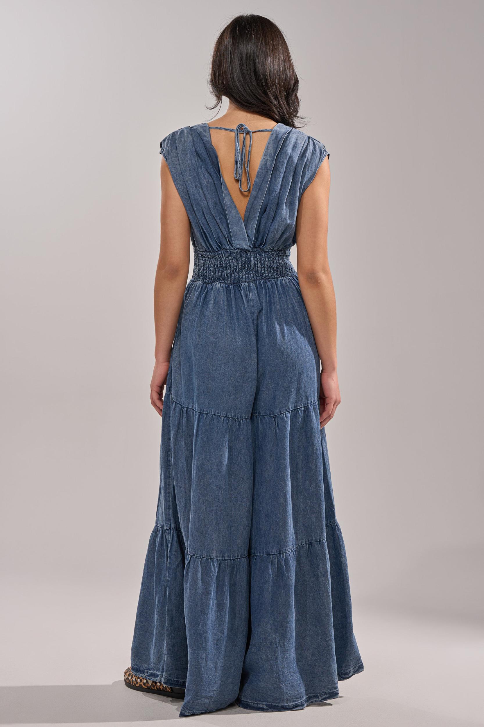 Slip into effortless casualwear with the AKIRA Label Kelly Denim Jumpsuit. Crafted from a lightweight fabric in a blue denim colorway, this one-piece boasts a plunging V-neckline and matching back, cap sleeves, a smocked panel that sculpts the waist, on-seam waist pockets, and flowy wide-leg pants with tiered seam detailing. Complete with a horizontal, self-tie back strap. Style with platform pumps and a red lip for warm-weather days, brunch dates, or casual nights out. - 100% Rayon- Hand Wash Cold- Some Stretch- Imported (all measurements approximate from size small)- 58” Shoulder to Hem- 18” Shoulder to Shoulder- 4” Sleeves- Model is 5’9 ½” and is wearing size smallProduct ID: 1079310