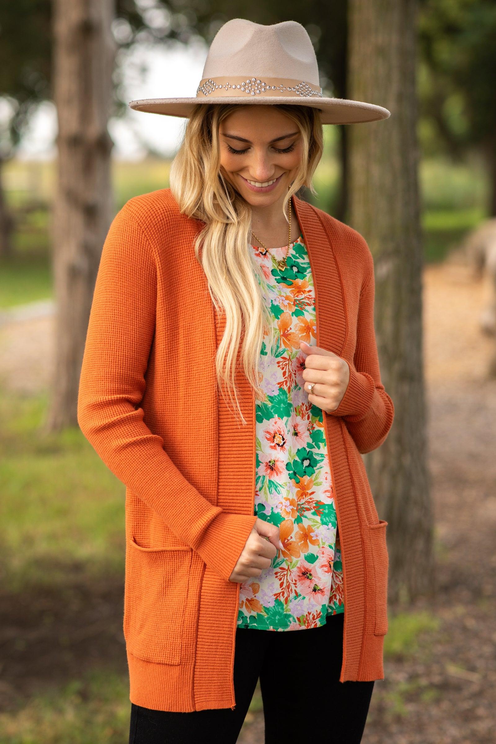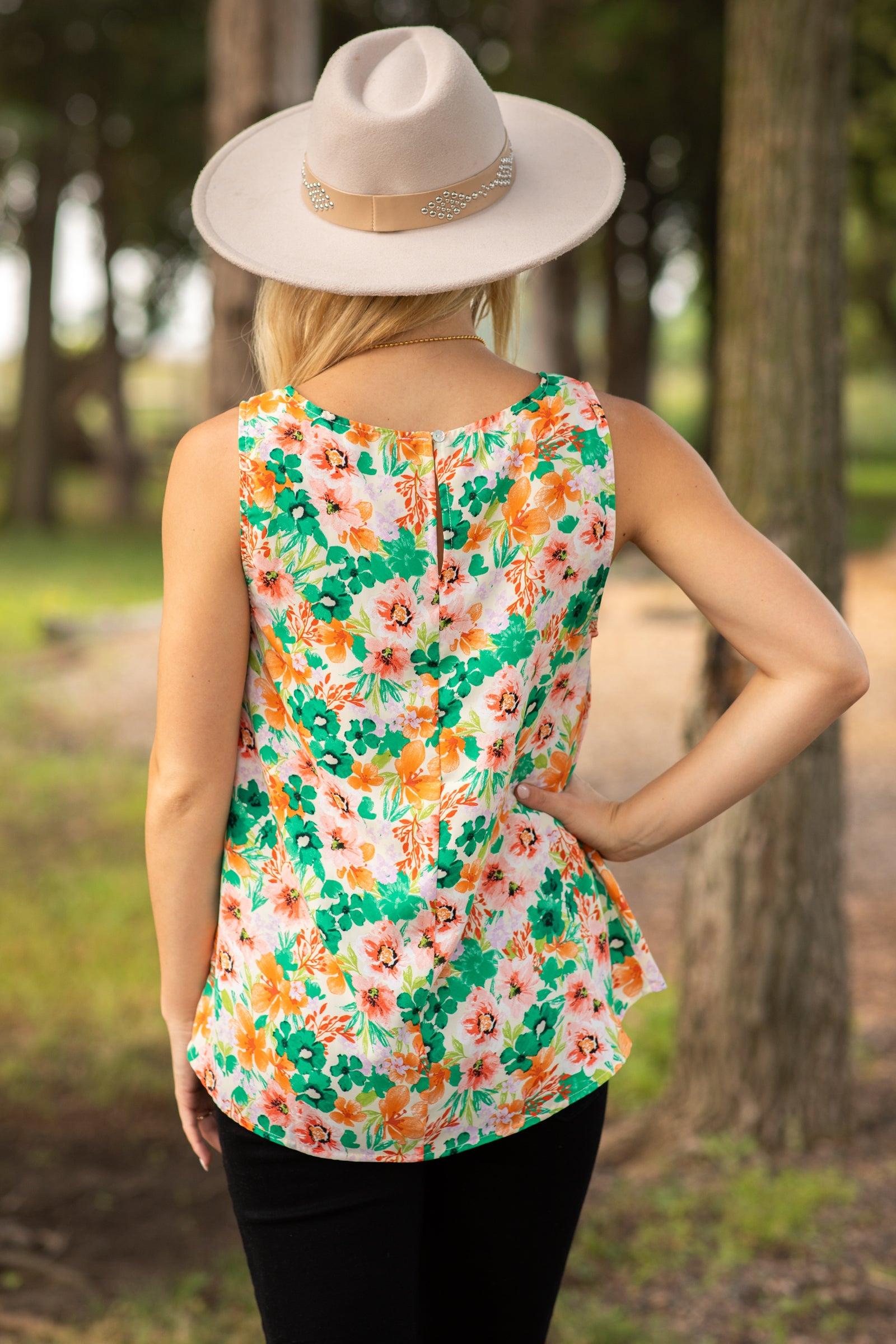 Product Details Colors: Kelly Green, Orange, Pink and Purple Print: Floral Neckline: Round Sleeves: Sleeveless Hemline: Straight Brand: Staccato Shown with Burnt Orange Waffle Knit Patch Pocket Cardigan Material and Care 100% Polyester Hand Wash Cold Line Dry Size and Fit Small: Bust 36" Waist 38" Length 26" Medium: Bust 38" Waist 40" Length 26.5" Large: Bust 40" Waist 42" Length 27" Photo model is 5'7" and wearing a size small Video model is 5’8" and wearing size small