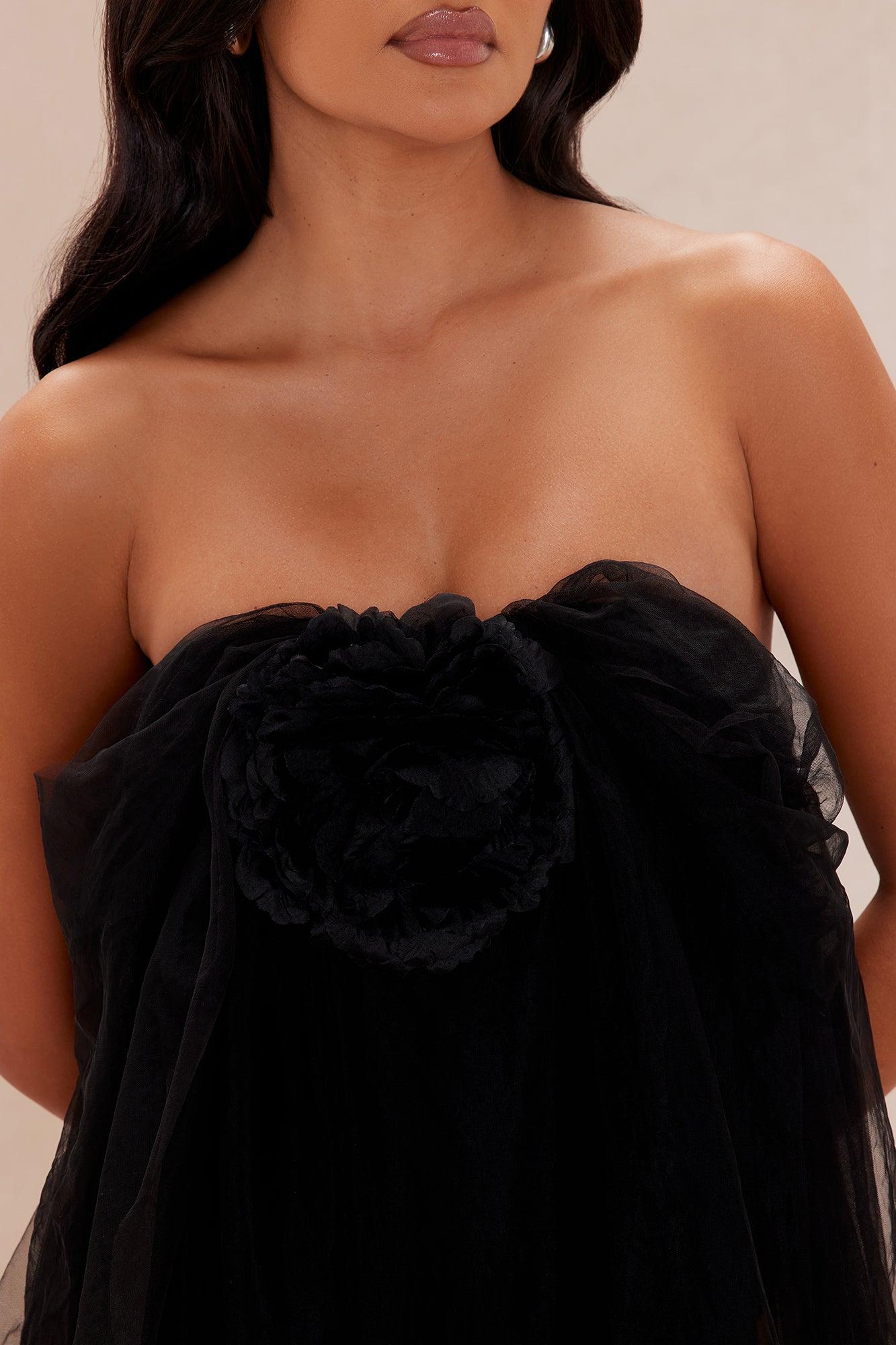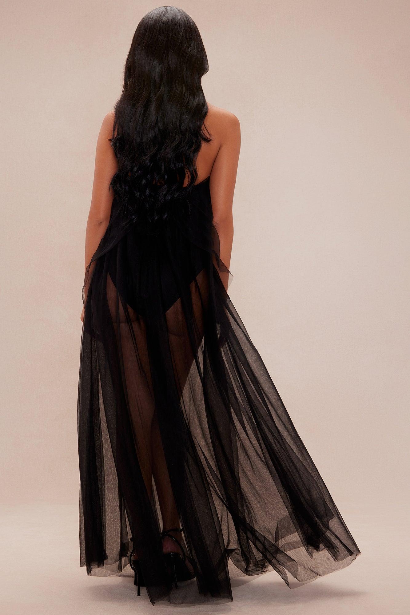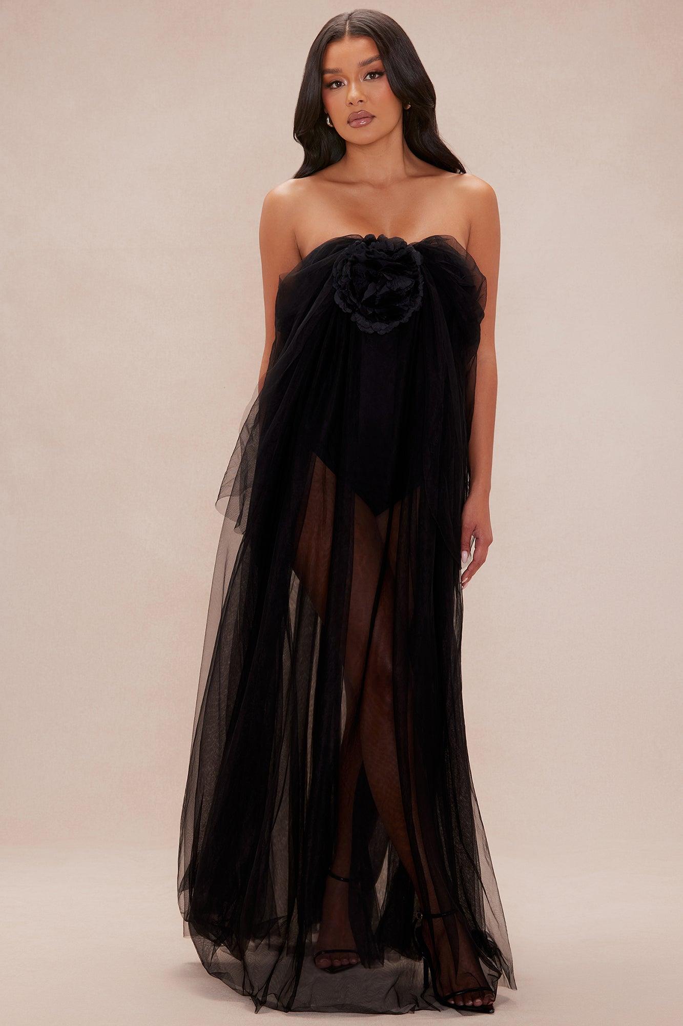 Available In Black. Mesh Maxi Dress Strapless Bodysuit Lining Sheer 3D Floral Detail Hidden Back Zipper Stretch Self: 100% Polyester Lining: 100% Polyester Imported