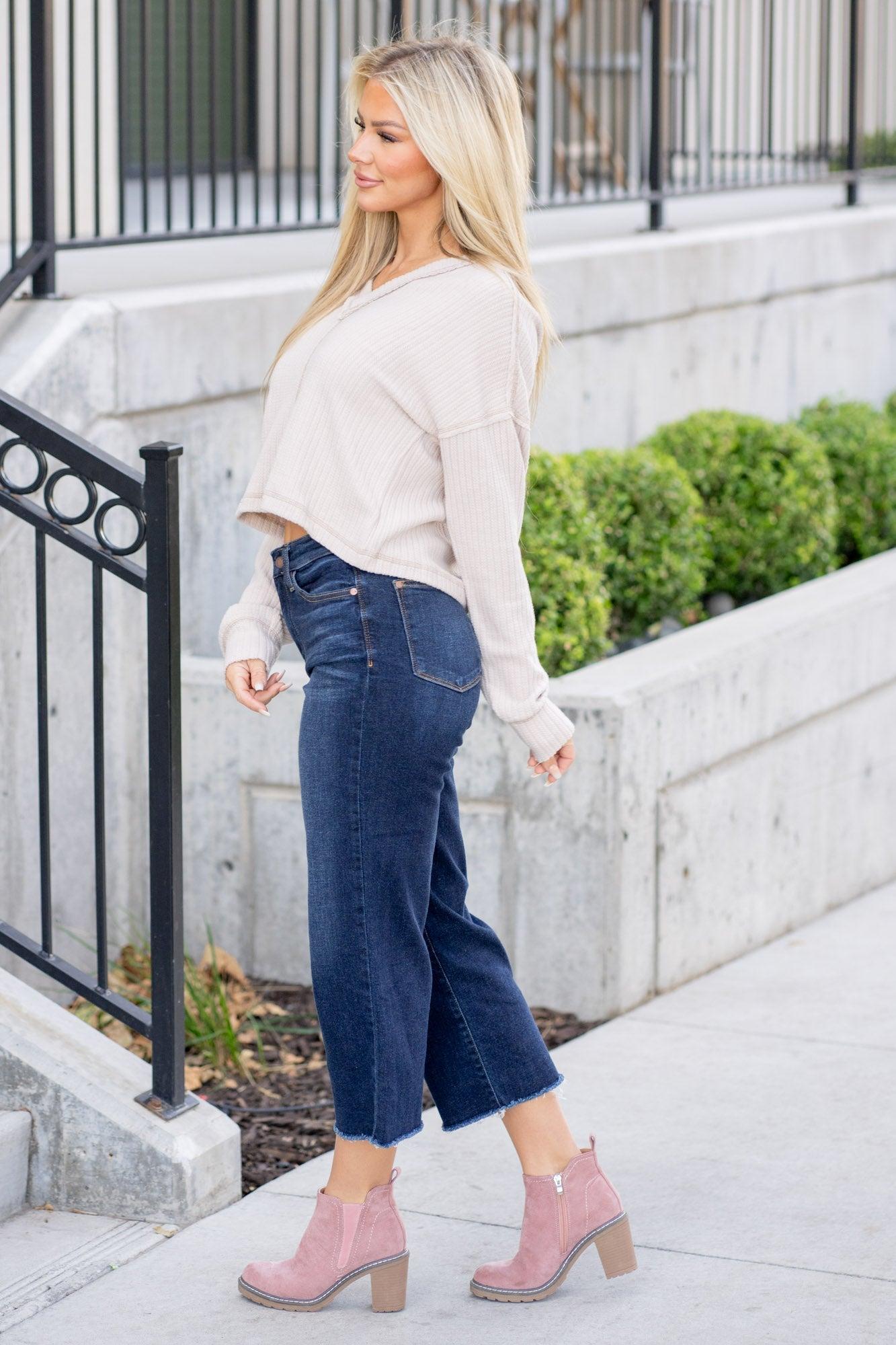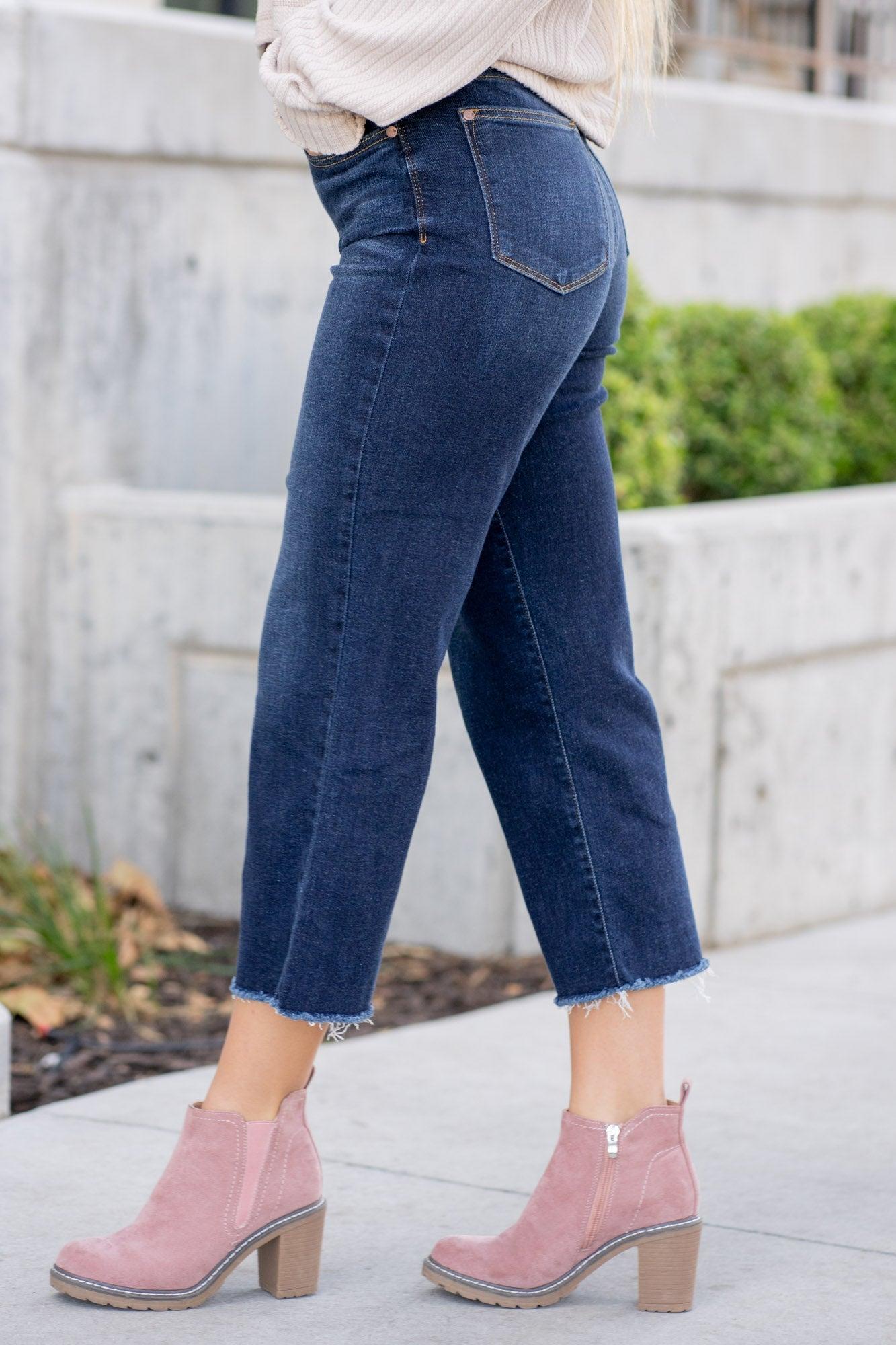 Introducing the Kelsea Wide Leg Crop Jean, your new go-to for chic and comfortable denim. With a high rise and trendy wide leg crop style, these dark wash jeans will elevate any outfit. Zip fly closure and raw hem add a touch of edge. Details Dark Wash Wide Leg Crop Jeans High Rise Zip Fly Closure and Raw Hem Rise: 10.75" | Inseam: 24.5" Material & Care 93% Cotton 6% Polyester 1% Spandex Machine wash cold inside out / Tumble dry low Materials may have natural variations Colors may vary from different viewing devices.