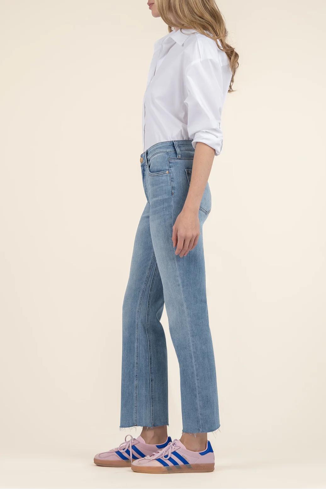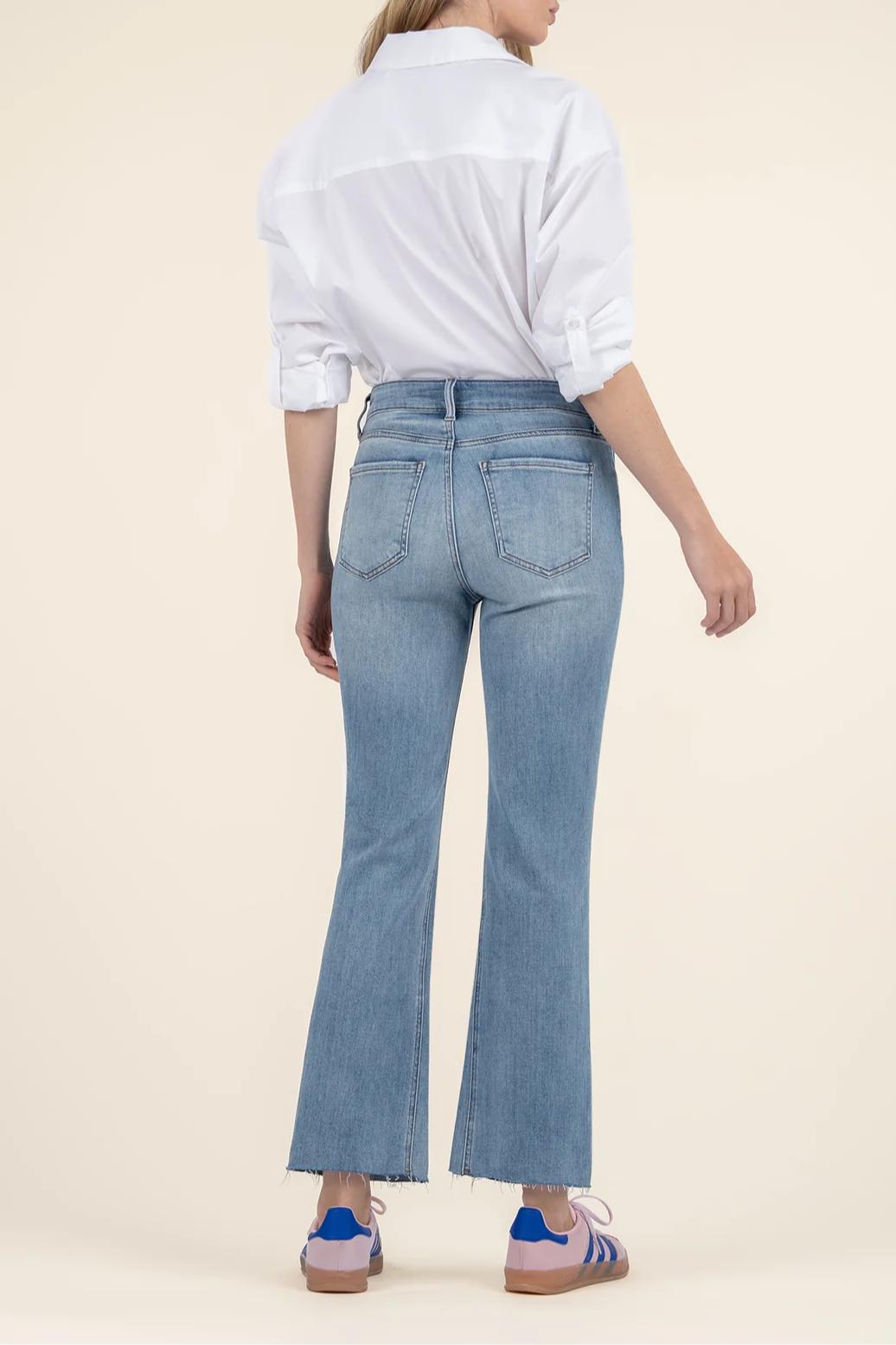 These High-Rise Ankle Flare Jeans in a medium wash are a must-have for your wardrobe. With a flattering fit, raw hem, Fab Ab pockets, and stylish flare, they’re perfect for everything from everyday wear to any occasion. A timeless, comfortable, and trendy piece that pairs with any look.