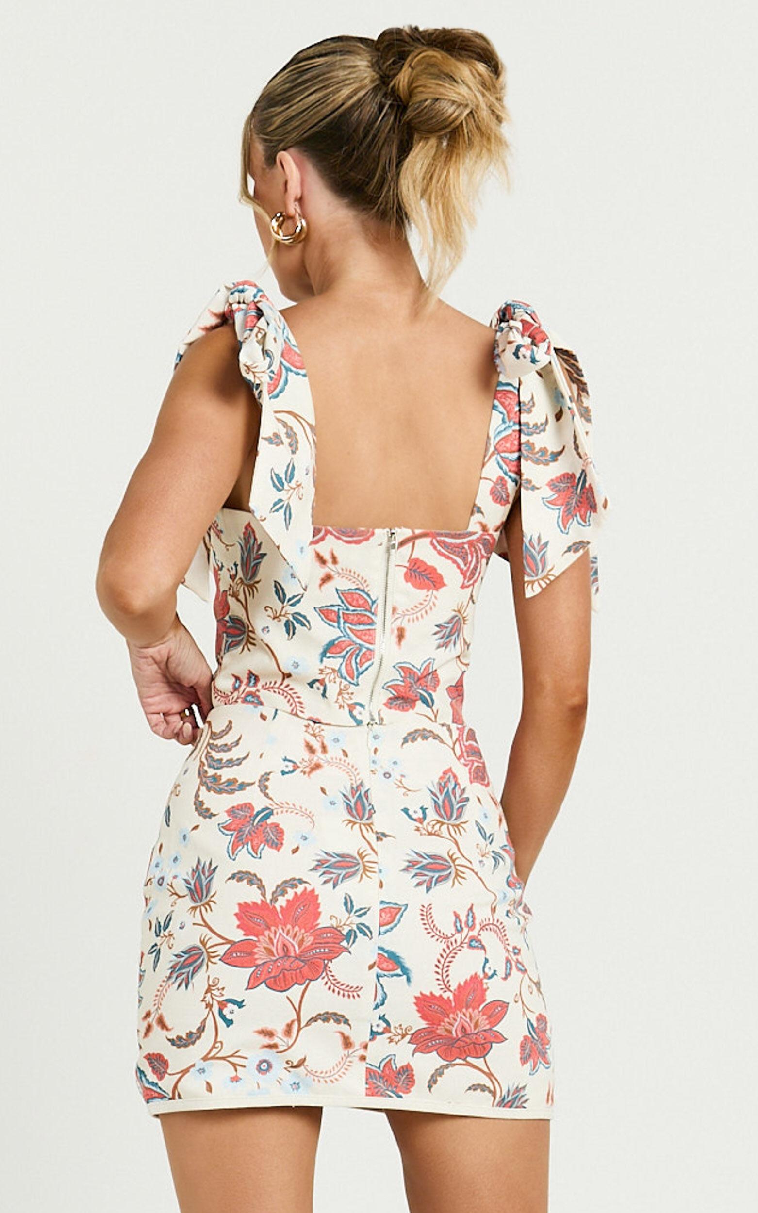 Make a statement in the Kelsie Top, a tie-shoulder crop with a sweetheart neckline that's as bold as you are. Crafted from a luxurious linen-look fabric, this top is a staple piece that embodies both comfort and chic styling. Its cream hue and summer chintz pattern promise an effortlessly elegant look that transitions seamlessly from a lively party day to a casual, yet sophisticated evening affair.Product Details:Zips detailInner liningLinen fabricSweetheart necklineParty day perfectCrop lengthSleevelessSize and FitSize S / 8 length: 23.5cm / 9.25inMaterial and CareMain Fabric: 54% Cotton, 46% Linen Lining: 100% CottonNo StretchNatural FibresThe main fabric of this product is made from 100% Natural Fibres. Whilst some of these fibres still have detrimental impacts in their supply chain, Natural Fibres have a reduced overall impact compared to a raw polyester.
