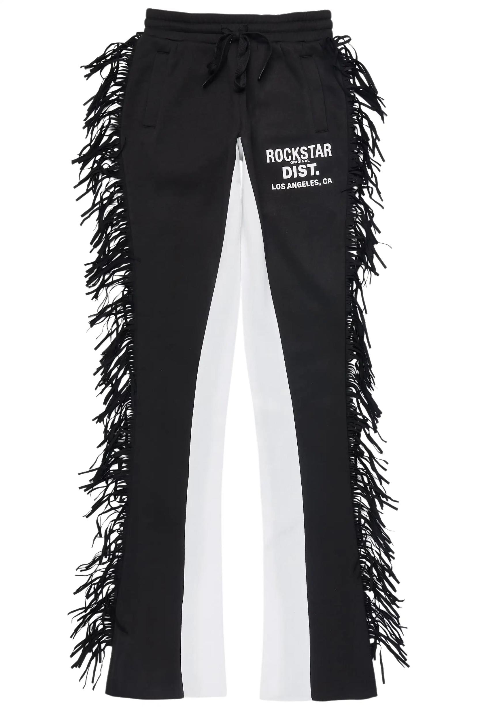 An athleisure stacked tracksuit pant for women in black. Designed with lightweight fabric and extra long legs for the perfect everyday style. Drawstring waistband Dual slant zip pockets Fitted through the hips Printed RSO logo Color block designing Custom fringe detailing Stacked construction 36" inseam