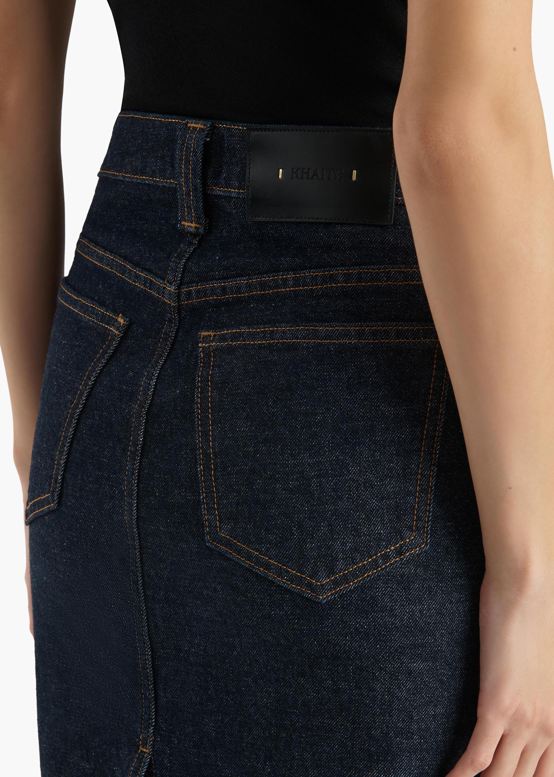 A robust and sophisticated pencil skirt made in Los Angeles of classic indigo denim traced by marigold topstitching. The high-rise, five-pocket silhouette is eased by a back slit. A tacked cuff reveals the lighter reverse of seamed denim. Signature nickel button and calfskin back panel.