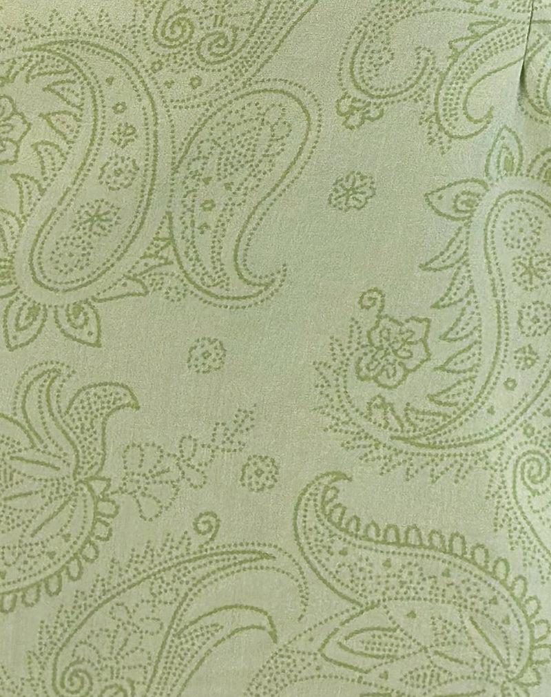 Our Kenja mini dress in a retro paisley lime print on an SSR fabric base. Displaying an off the shoulder bardot design with frilly detailing on the chest and a self tie fabric bow in the centre front. MODEL WEARS SIZE:EXTRA SMALL - MODEL HEIGHT:5'6.5