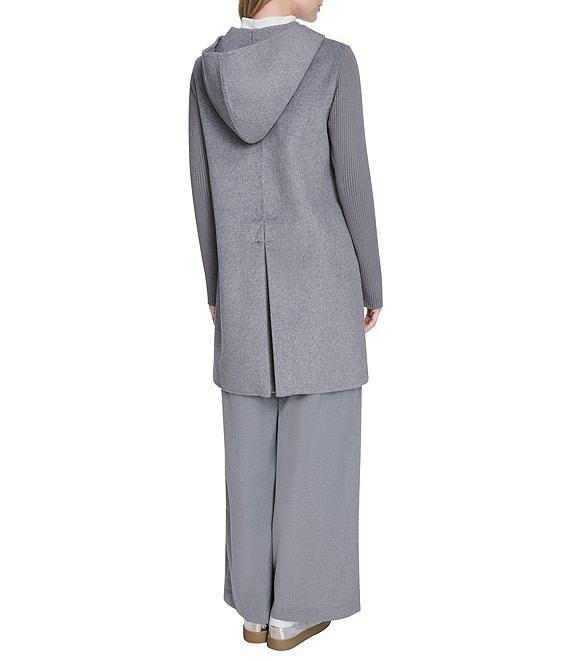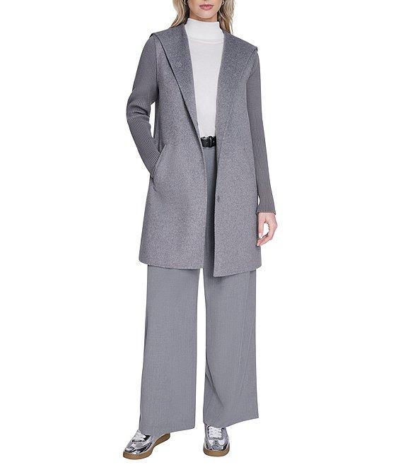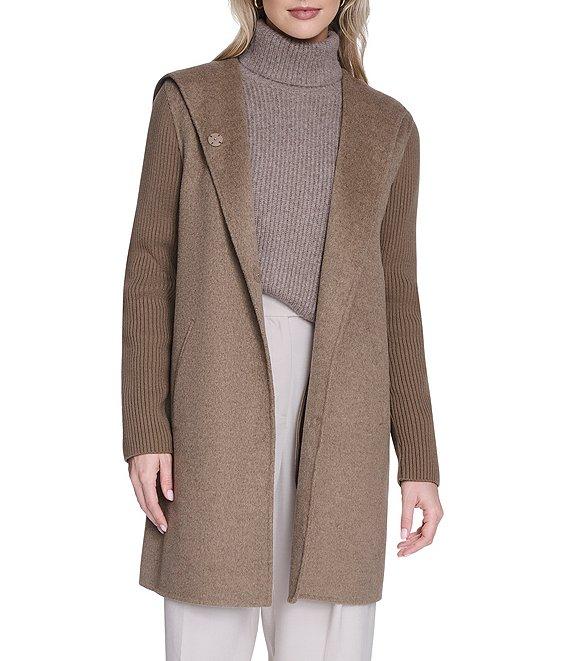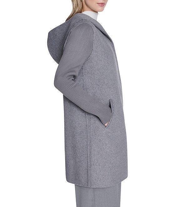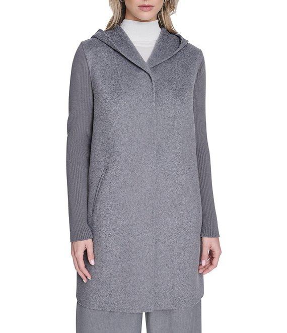 From Kenneth Cole New York, this coat features: Wool knit fabrication Double breasted silhouette Hooded Long sleeves with adjustable snap cuffs Two seam welt pockets Fully lined Straight hemline Front snap closure Approx. 34" length Wool/polyester/acrylic; lining: polyester Dry clean Imported.