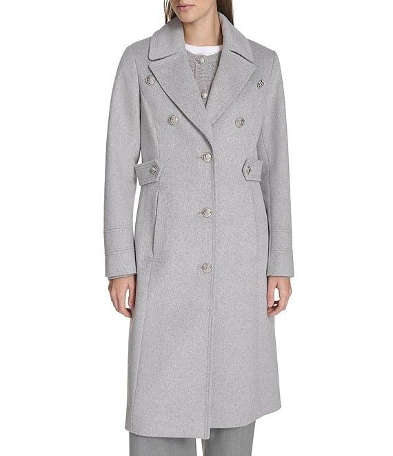 From Kenneth Cole New York, this coat features: Military wool fabrication Single breasted silhouette Notch collar neckline Long sleeves Side waist tabs with button Two seam welt pockets Fully lined Straight hemline Button front closure Approx. 42.5" length Polyester/wool/other fibers; lining: polyester Dry clean Imported.