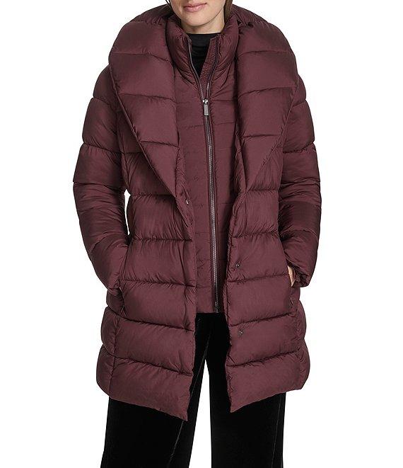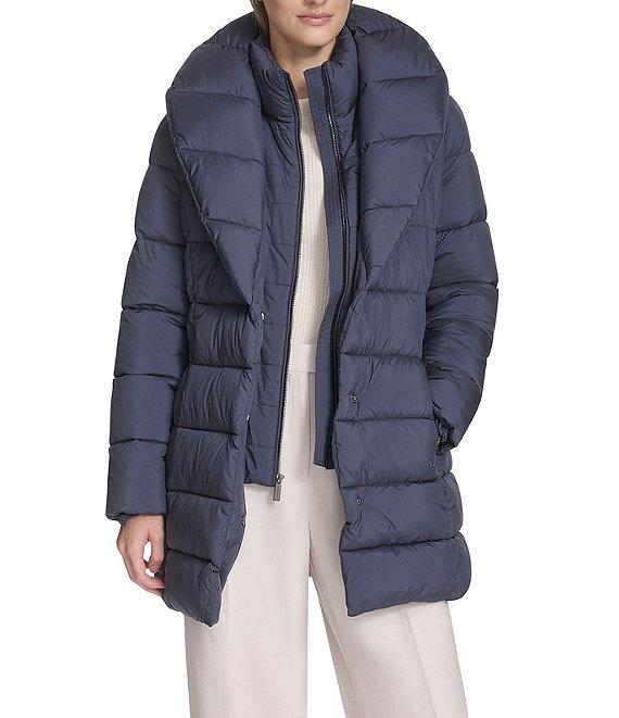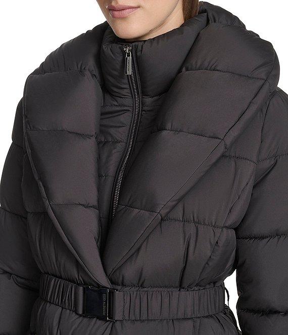 From Kenneth Cole New York, this coat features: Puffer silhouette Stand collar neckline Long sleeves Vertical seam pockets Belted Seat belt buckle Pillow collar Water resistant Synthetic fill Midweight Standard fit Fully lined Straight hemline Exposed center front zip closure Approx. 28" length Polyester; lining: polyester Machine wash Imported.