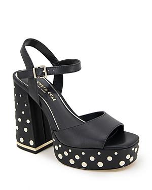 Its all in the . Details: Womens platform sandal Open toe Buckle ankle closure Cushioned insole Gold-tone trim at heel Stud detail 1 in. platform 4 in. heel height Wipe clean Imported | Kenneth Cole | Dolly Stud Ankle Strap Platform Heeled Sandal in Classic Tan, Size: 5.5