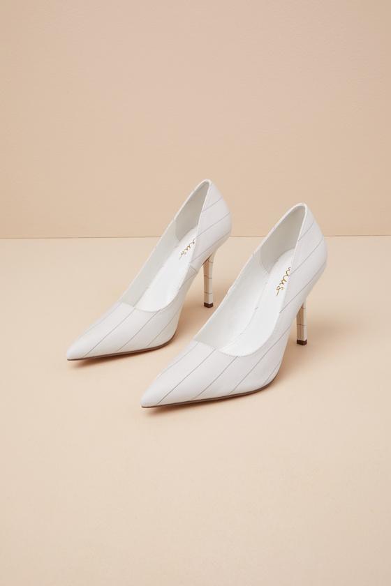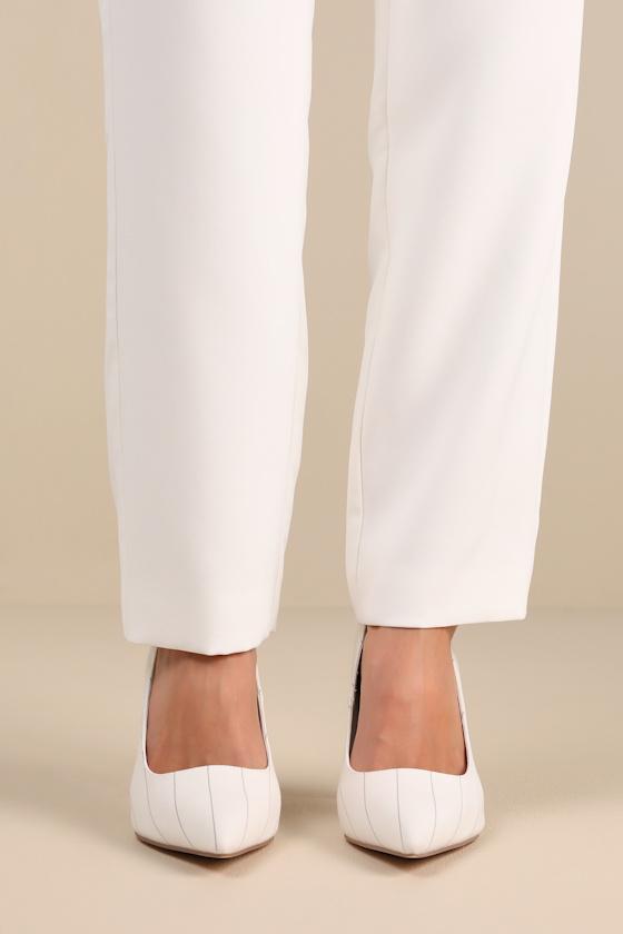 With chic looks like the Lulus Kennett White Pinstripe Pointed-Toe Pumps, you'll instantly be the office fashionista! Sleek woven fabric, with a timeless pinstriped design throughout, shapes these sophisticated pumps that feature a classic pointed-toe upper with a low-cut collar. An eye-catching stiletto heel completes the look!