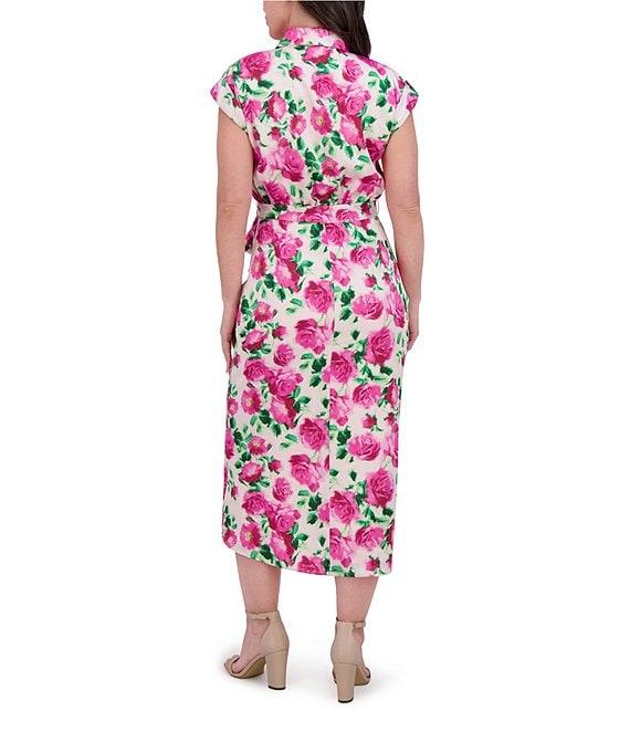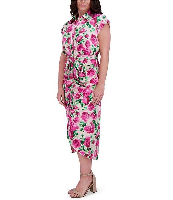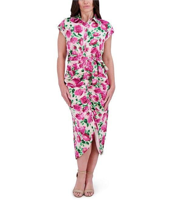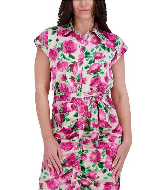 From Kensie, this dress features: Charmeuse fabrication Floral print Shirt dress silhouette Point collar neckline Short sleeves Button front detail Waist tie detail Lined Back zipper closure Approx. 48" length Polyester Machine wash/dry flat Imported.